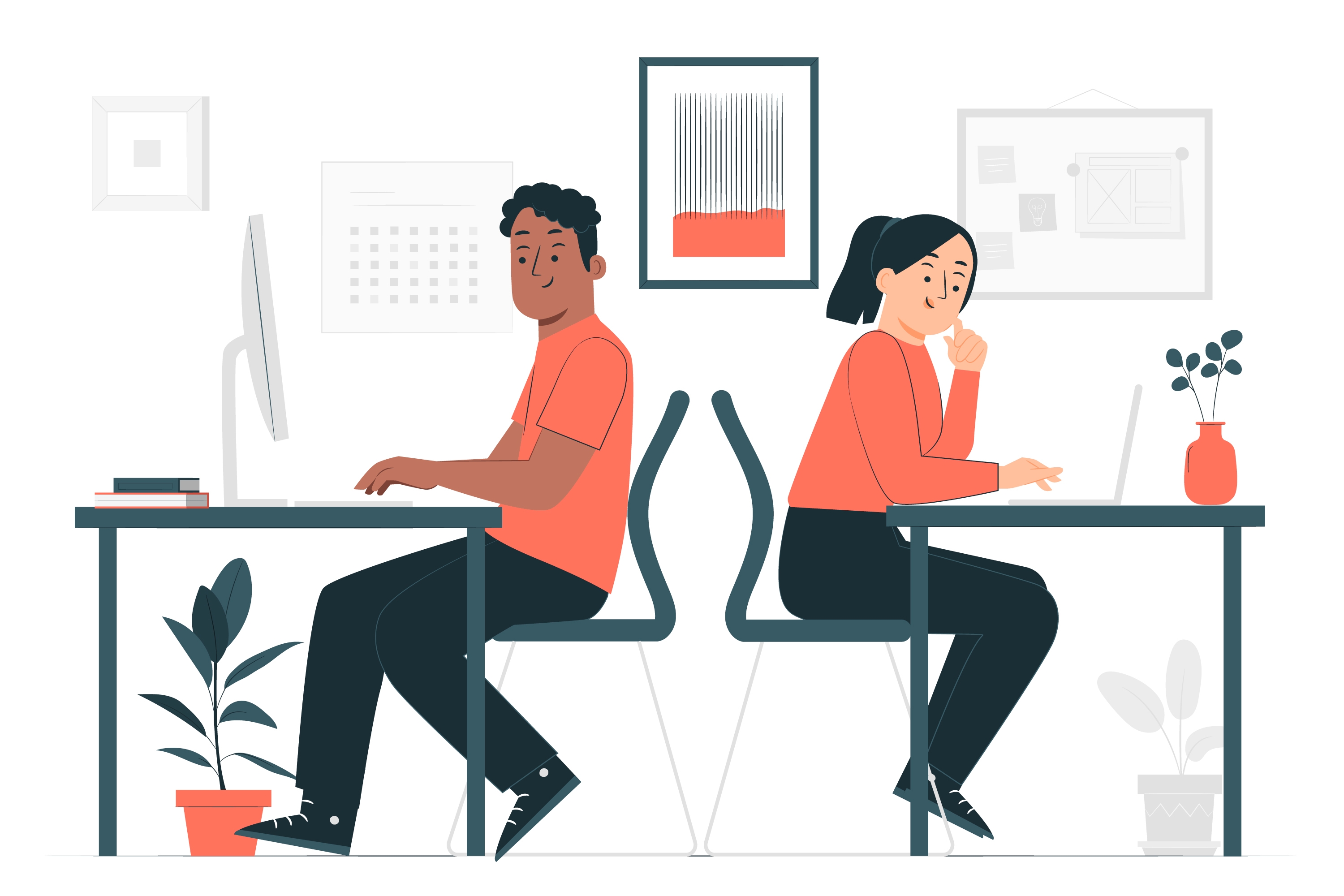 1 张 卡通带龟背竹盆栽的现代电脑办公室