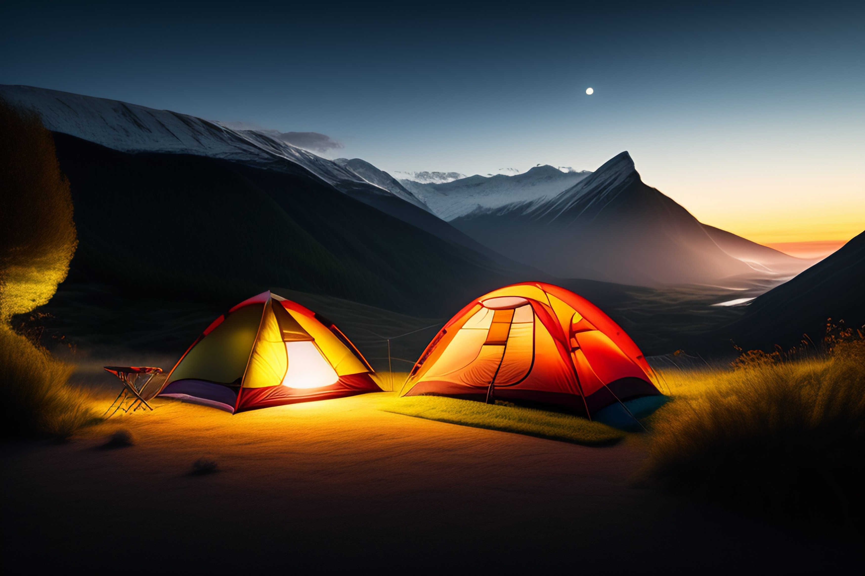 1 张 傍晚雪山脚下的露营帐篷夜景图