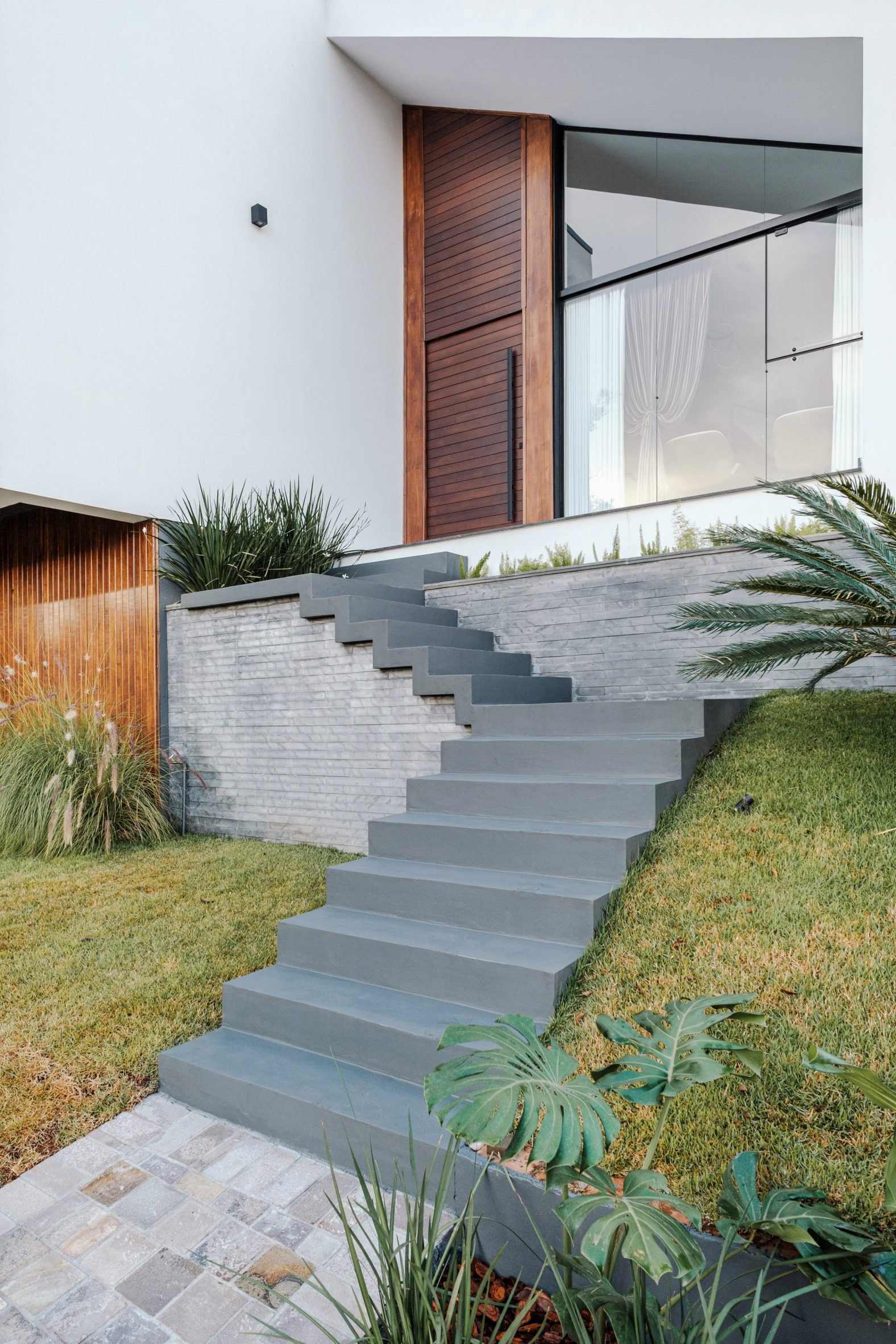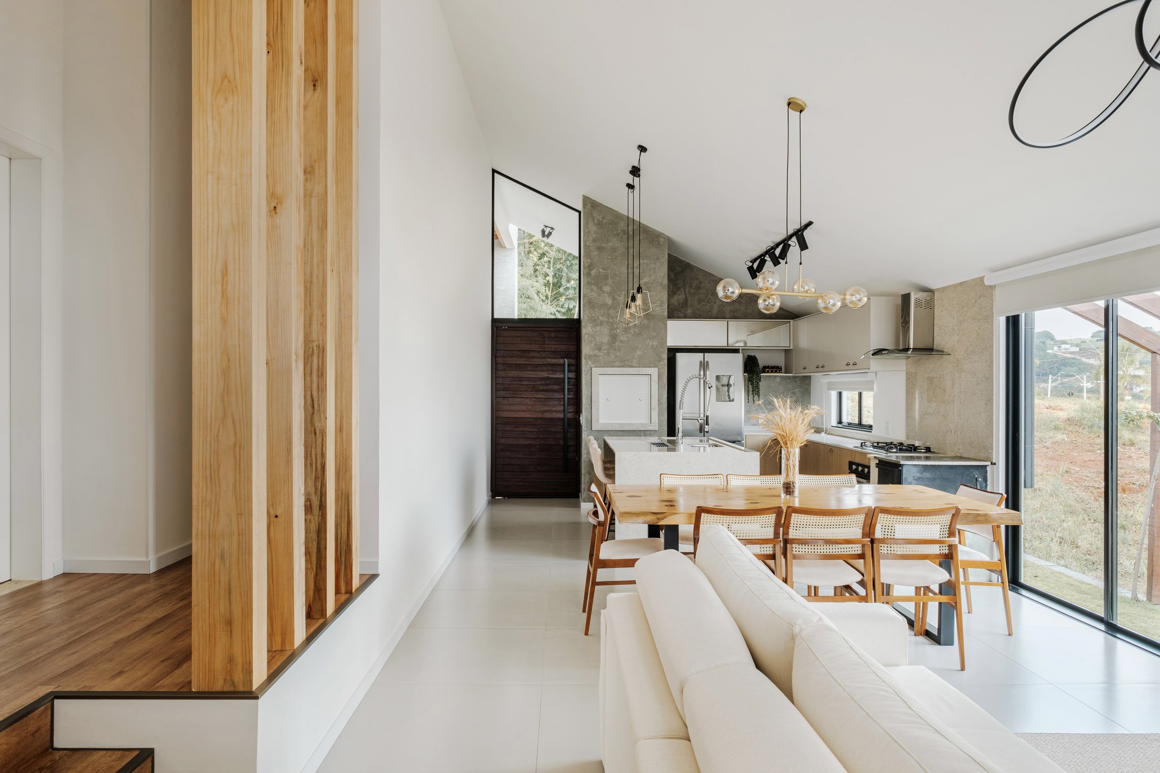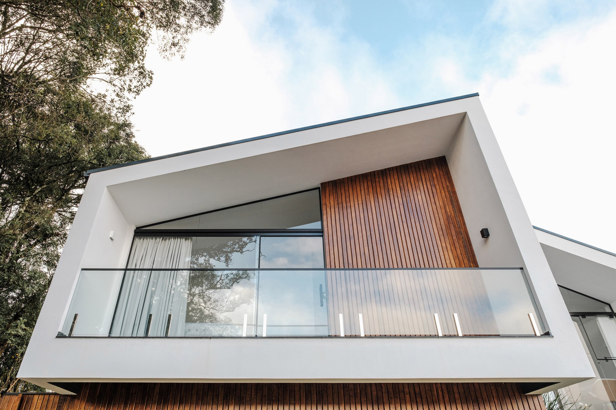 • KUNZ在巴西南里奥格兰德州的一个斜坡上建造了一座紧凑的山墙房屋,由两个并排的梯形部分背靠背排列而成,“对山墙屋顶原型的重新诠释”。这座房子位于小镇的城市边缘,以温暖的木材色调迎合了客户对乡村的热爱,这些色调参考了构成斜坡场地的南洋杉树。使用了“梯形形式的斜角来突出视角,并为立面提供视觉活力”。这座1830平方英尺(170平方米)的房子沿着中心山脊线被分割,东半部分越过挡土墙向街道突出,西半部分向后延伸到场地的斜坡上。这种布置使结构在石板楼梯上显得平衡,为家中干净的白色线条提供了乡村的基础。