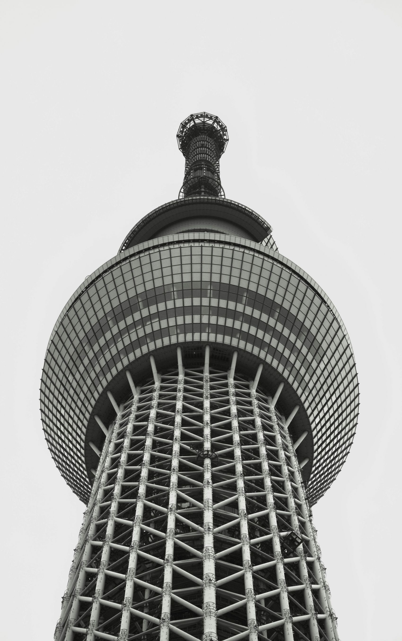 1 张 黑白色调下的东京晴空塔特写:现代建筑钢结构与玻璃幕墙的工业美学