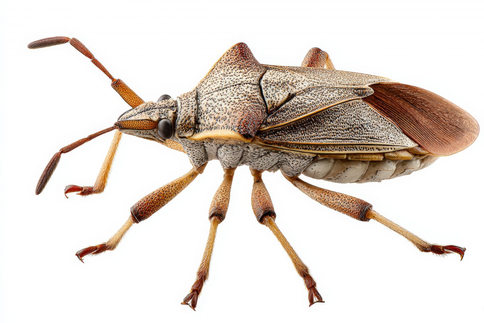 这是一只麻皮蝽(俗称 “臭屁虫”“臭大姐”),属于半翅目蝽科昆虫,体背覆盖灰褐与棕红色相间的细密斑纹,前胸背板有尖锐的棘状突起,足与触角呈黄褐渐变配色,翅膀后半段为深褐色,整体外观具有典型的蝽科昆虫盾形轮廓;其以植物汁液为食,受惊时会分泌含醛类物质的臭液(防御天敌),广泛分布于温带、亚热带地区的农田、林地,是常见的农业害虫之一,但部分地区(如中国汉中)会将其加工为食材 “九香虫”,具有一定的食用与药用价值,同时它既是农作物(如果树、蔬菜)的刺吸式害虫,也会捕食小型昆虫,在自然生态中属于中间营养级物种。