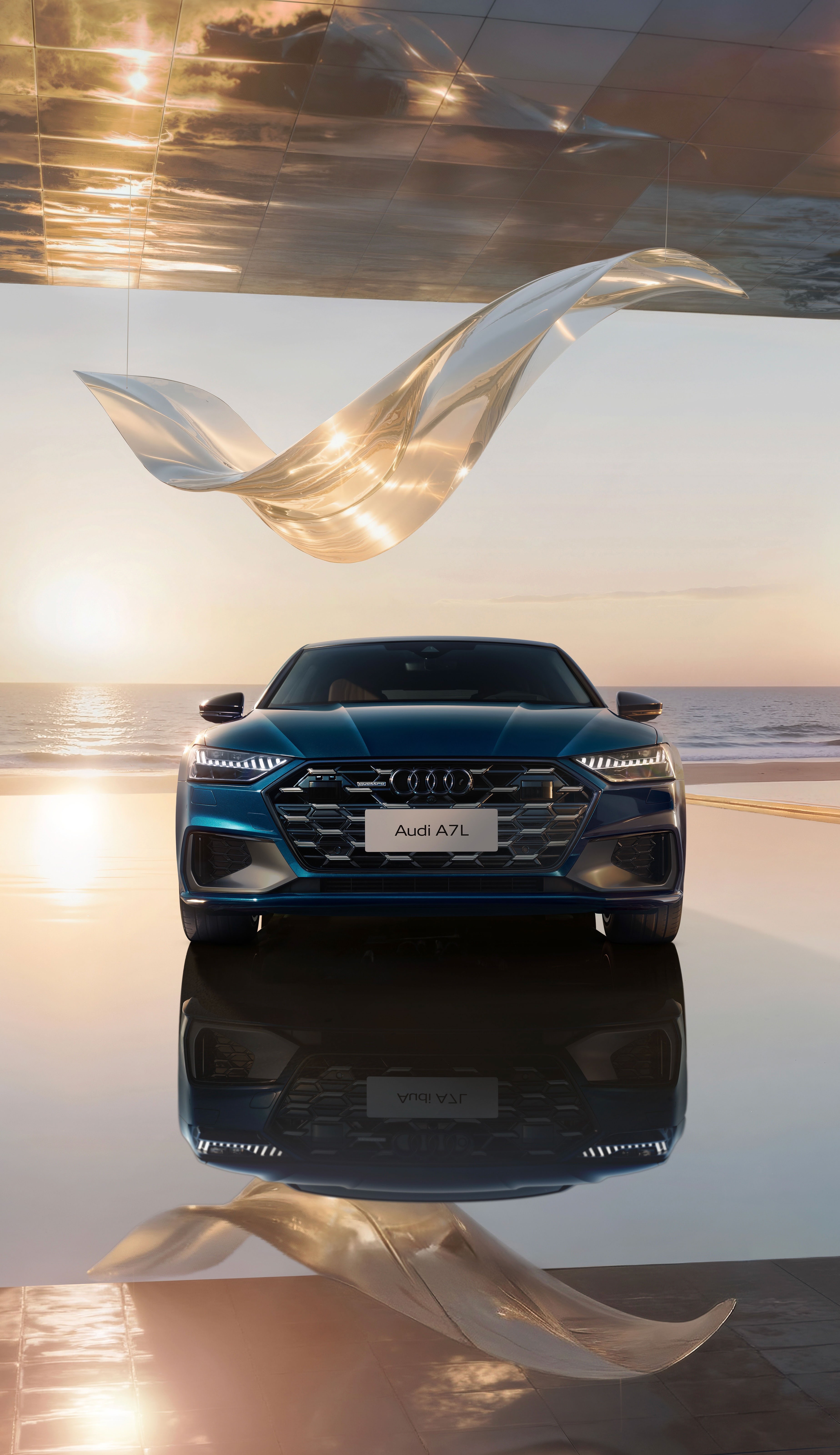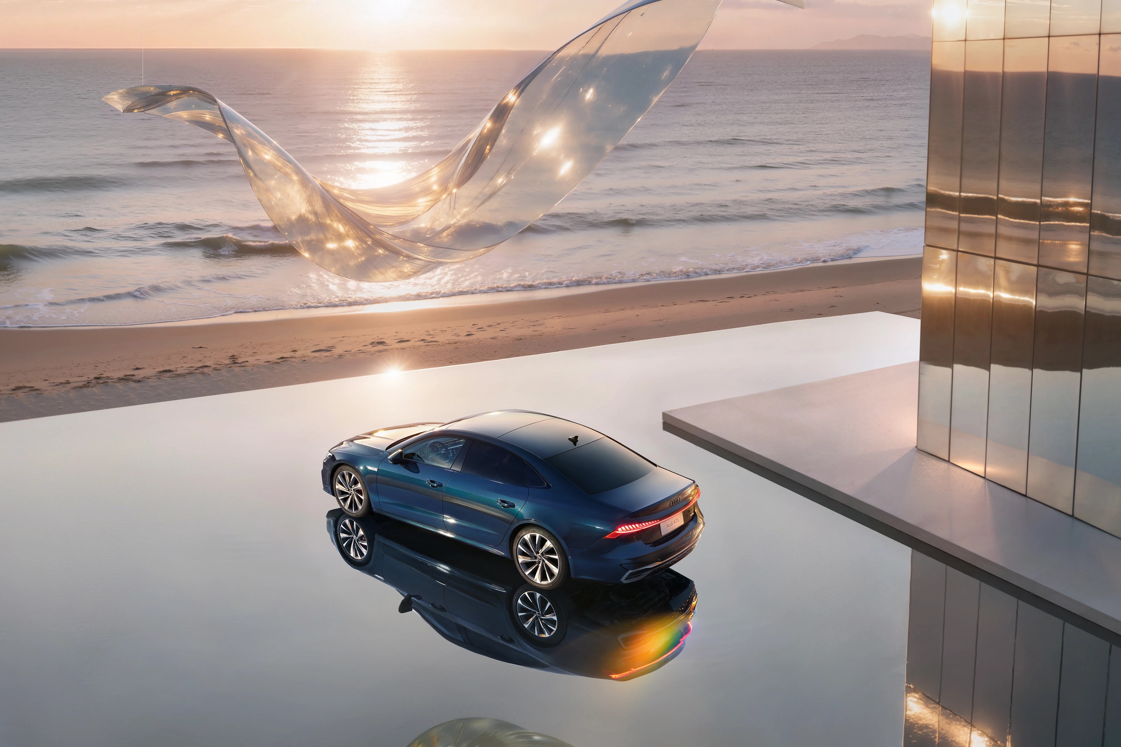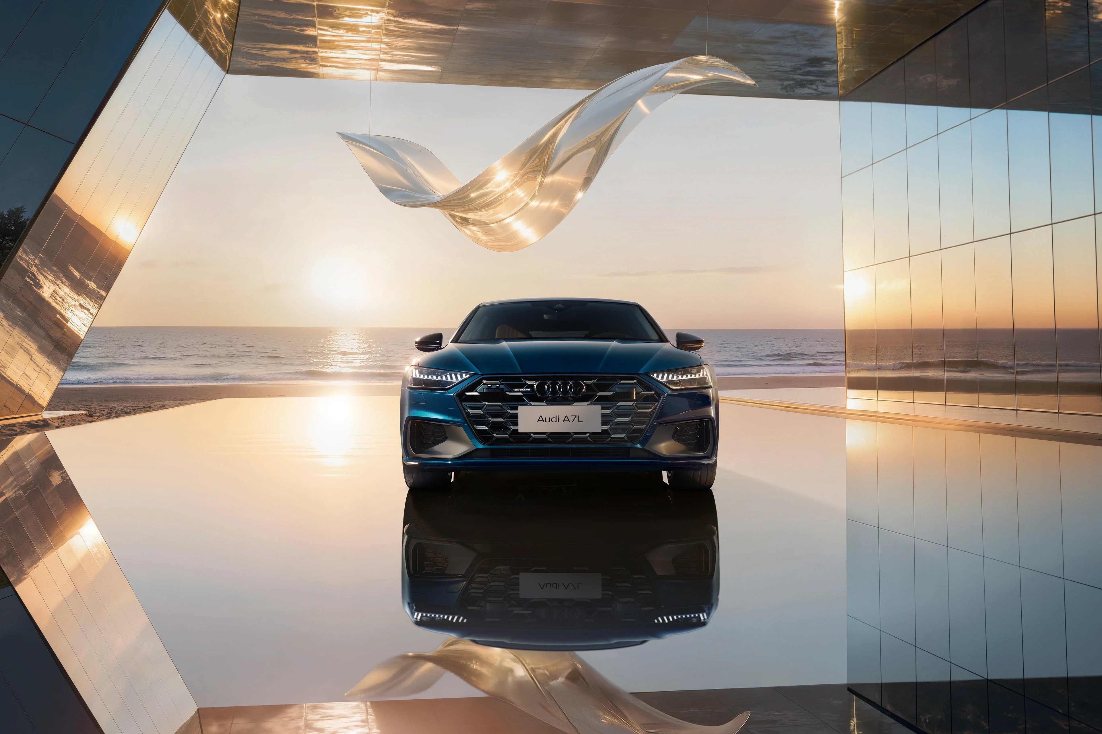 这是奥迪 A7L 车型的一组品牌视觉大片,以海滨日落为背景,结合现代建筑与悬浮的透明艺术装置,营造出奢华且充满未来感的氛围。深邃的车身蓝调在镜面地面与落日余晖的映衬下,凸显出溜背造型与流线型车身的优雅质感。人物舒展的姿态强化了 “优雅出行” 的产品调性,既展现了奥迪 A7L 的豪华设计与科技属性,也通过 “海滨 + 艺术 + 建筑” 的场景组合,传递出车型适配高端生活方式的定位。这类视觉作品常用于品牌宣传、线下展陈及社交媒体推广,是汽车营销中 “场景化美学表达” 的典型呈现。