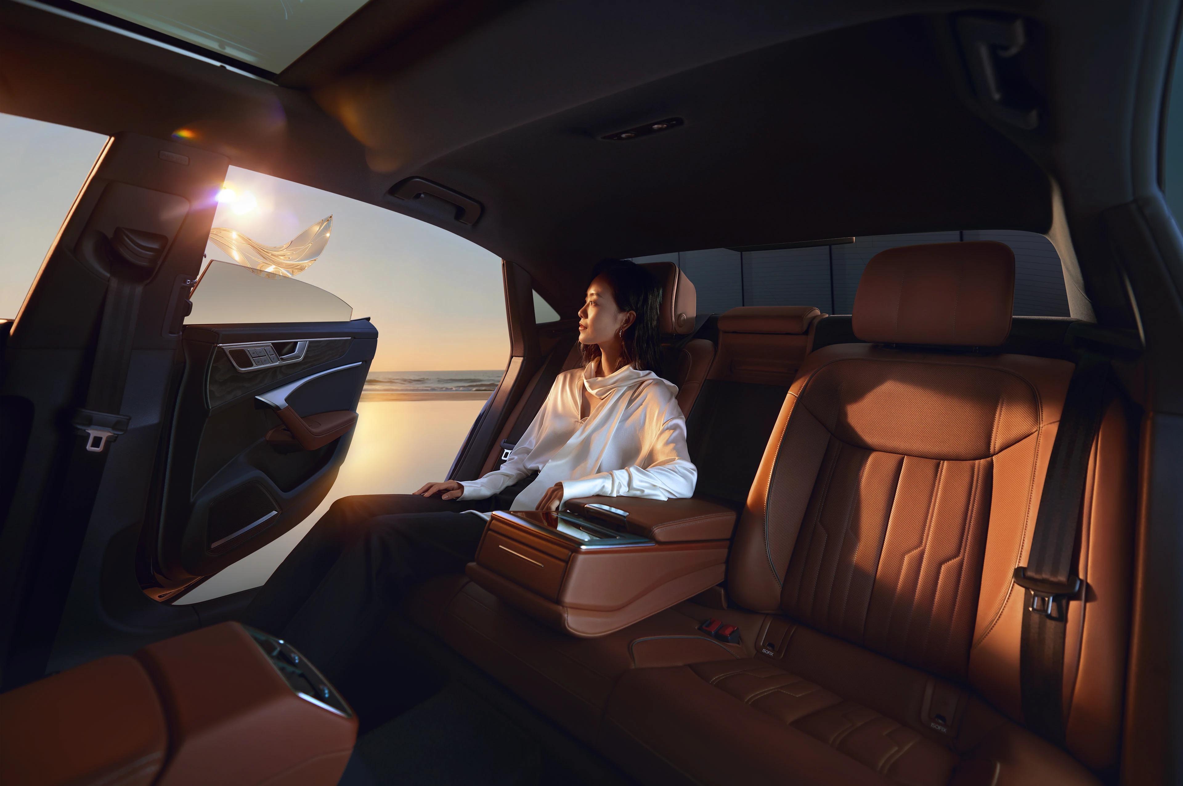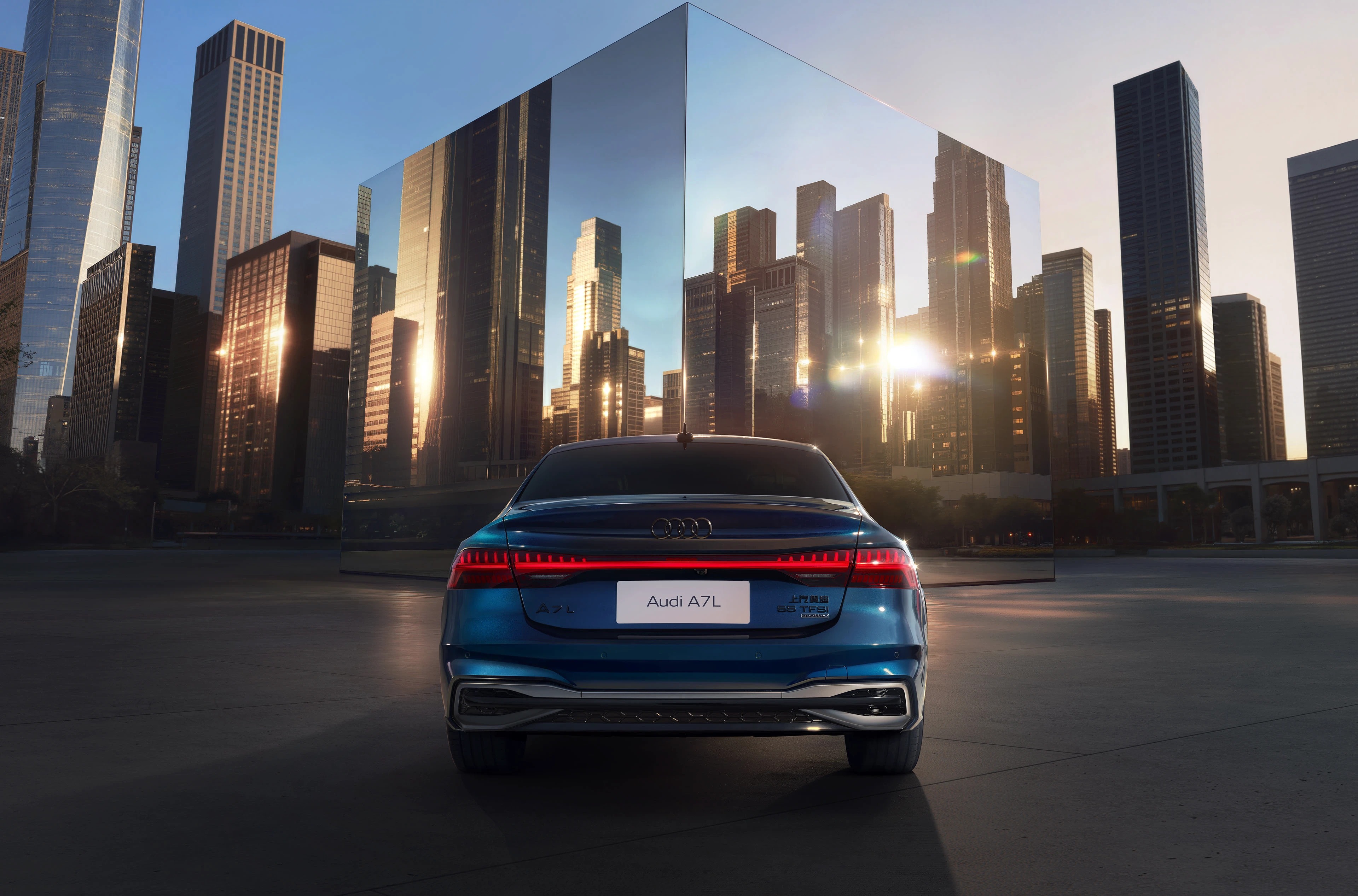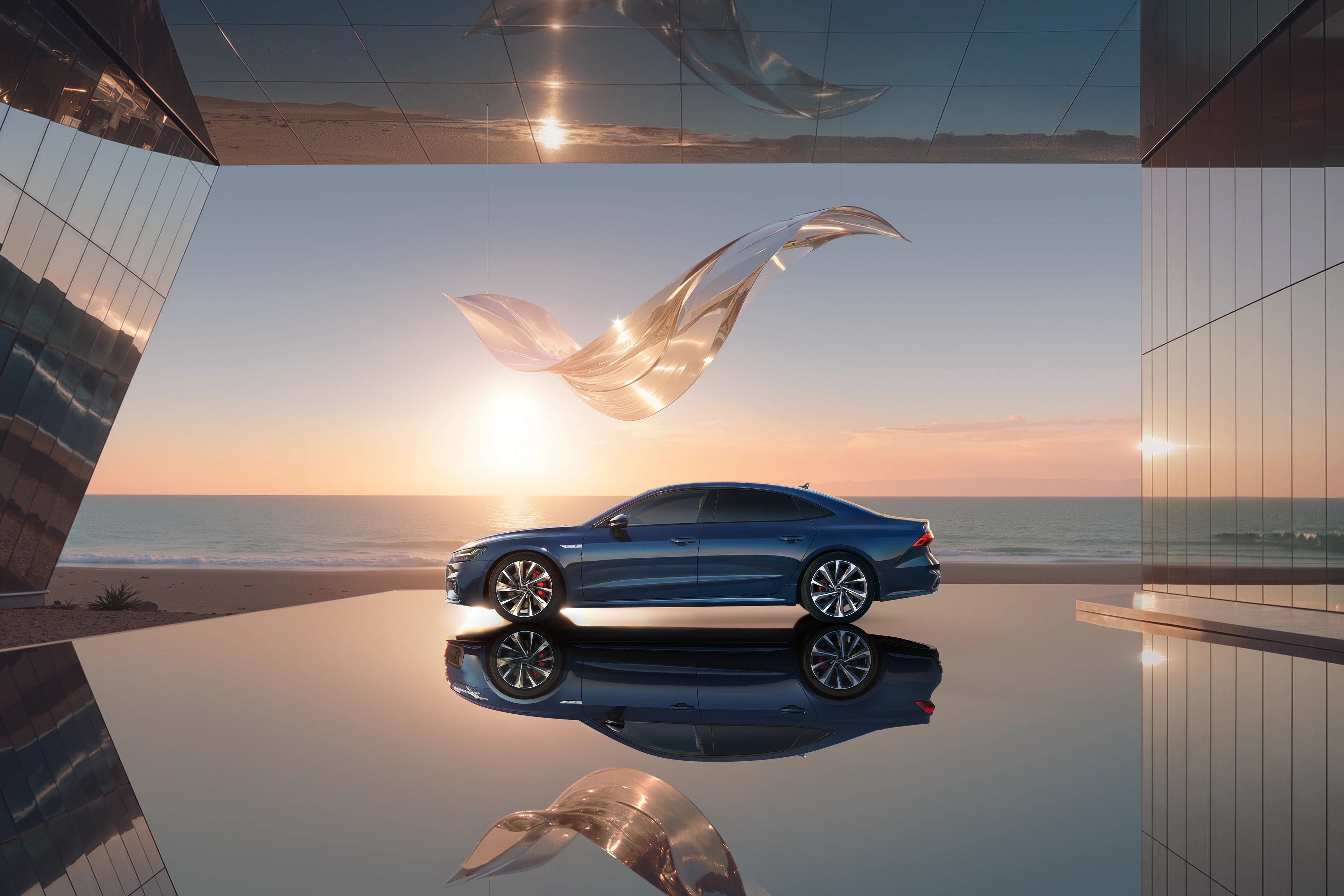这是奥迪 A7L 车型的一组品牌视觉大片,以海滨日落为背景,结合现代建筑与悬浮的透明艺术装置,营造出奢华且充满未来感的氛围。深邃的车身蓝调在镜面地面与落日余晖的映衬下,凸显出溜背造型与流线型车身的优雅质感。人物舒展的姿态强化了 “优雅出行” 的产品调性,既展现了奥迪 A7L 的豪华设计与科技属性,也通过 “海滨 + 艺术 + 建筑” 的场景组合,传递出车型适配高端生活方式的定位。这类视觉作品常用于品牌宣传、线下展陈及社交媒体推广,是汽车营销中 “场景化美学表达” 的典型呈现。