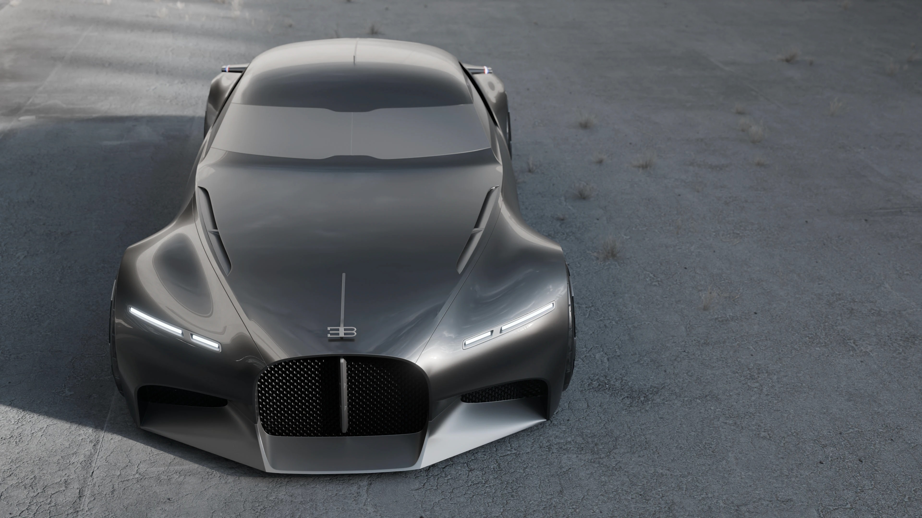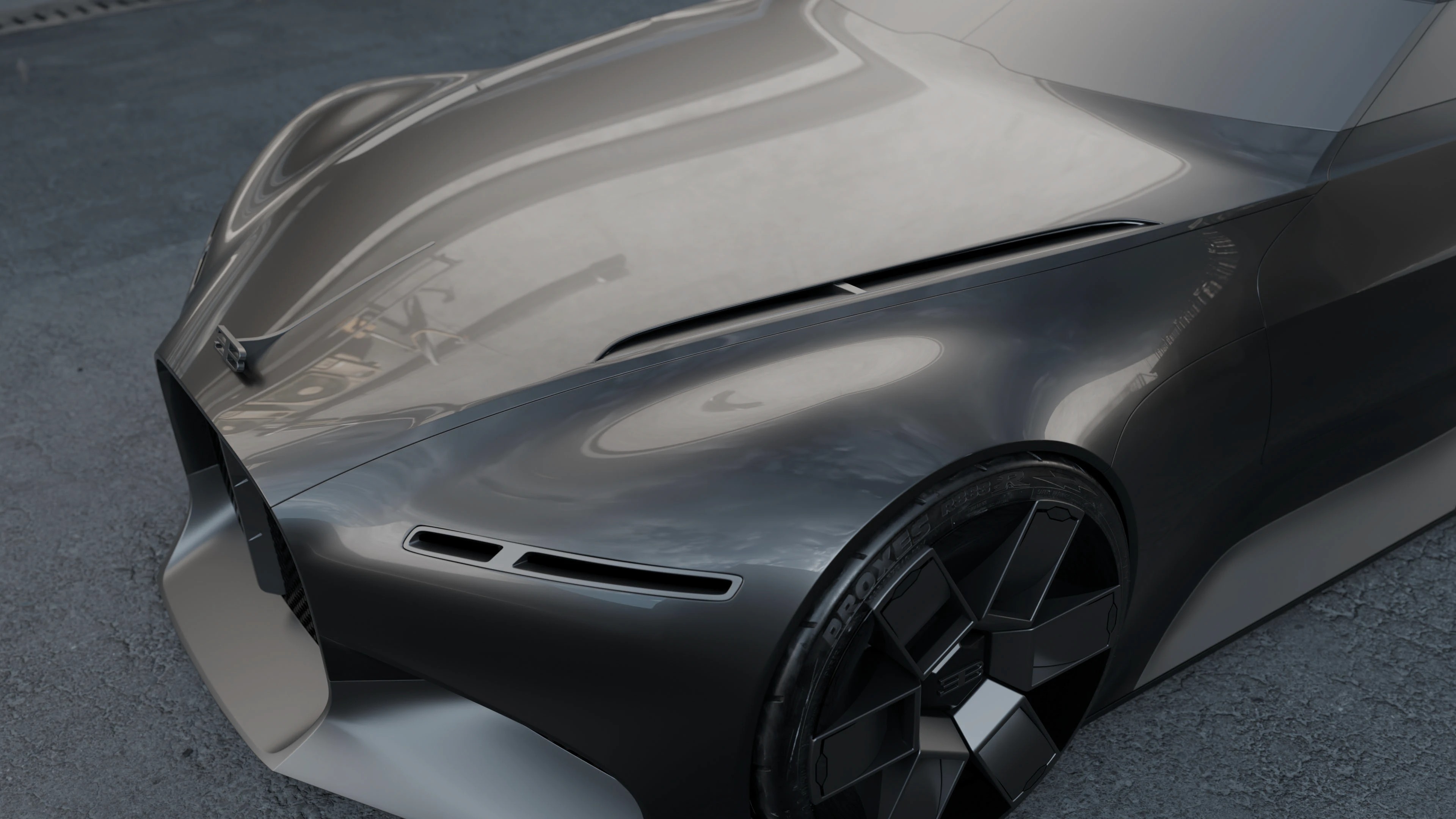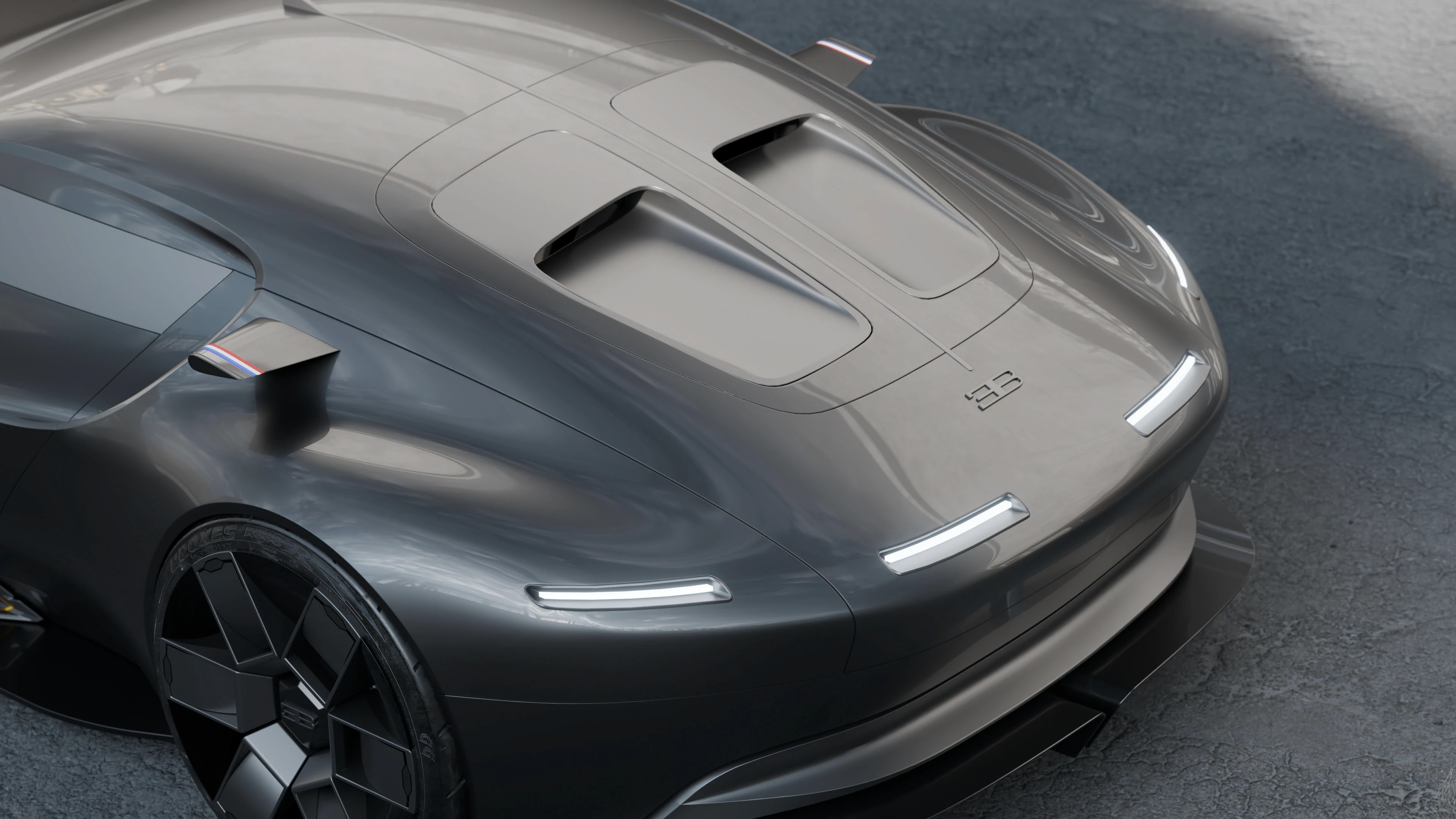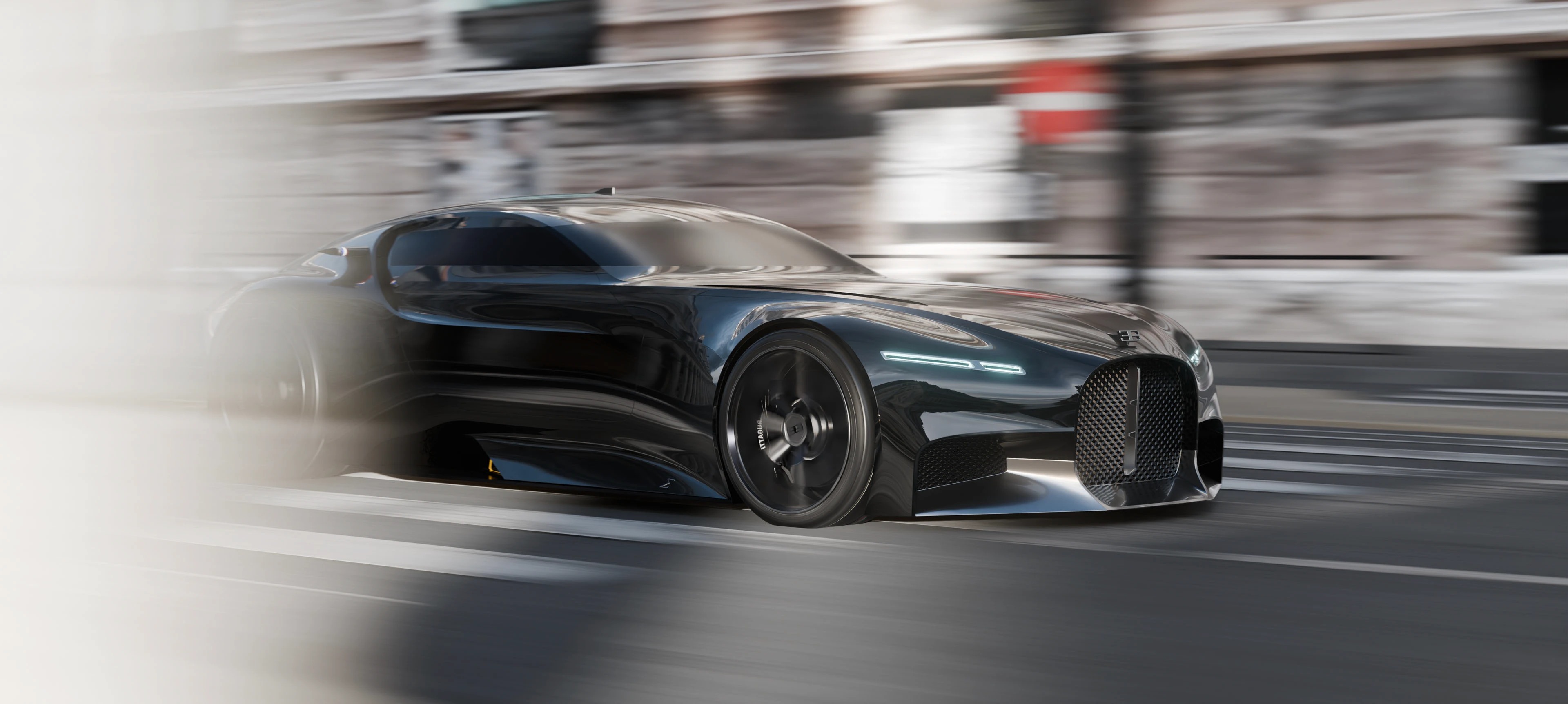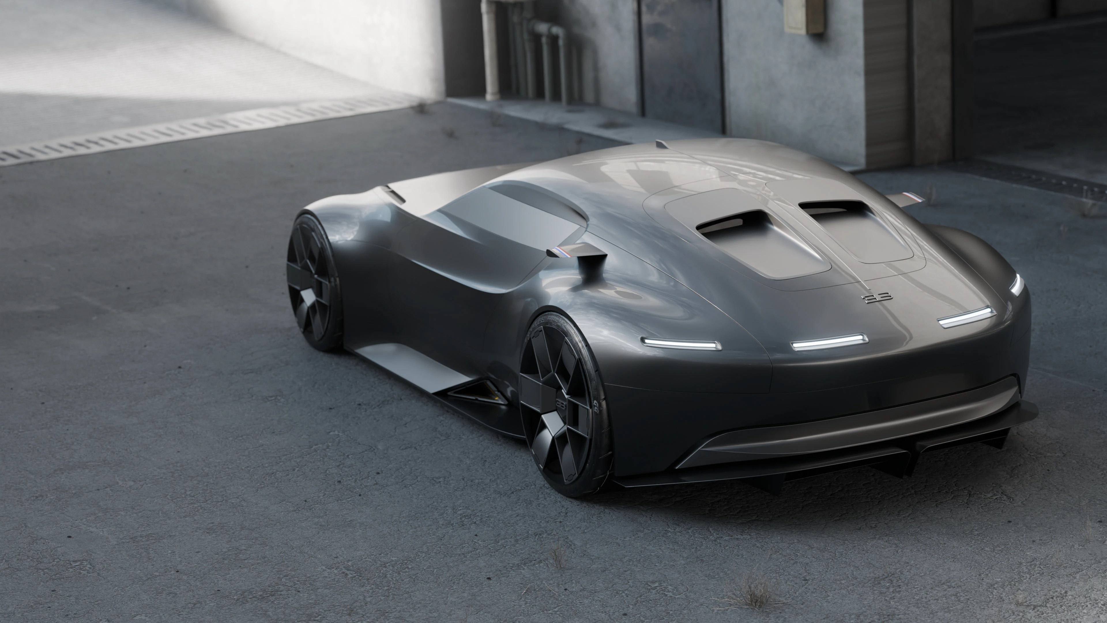 这组概念车渲染图呈现了布加迪对未来超跑的全新诠释,以哑光深灰金属漆为基底,用极简线条重构了品牌标志性的奢华与力量感,车身采用无门把手的一体化曲面,尾部双通风口与贯穿式 LED 灯带呼应,前脸保留了经典的马蹄形格栅,却以更锐利的几何线条重构,搭配多辐式几何轮毂与低趴姿态,既传承了布加迪的性能基因,又注入了未来主义的克制美学,哑光金属漆面在工业风场景中呈现出细腻的光影变化,车身侧面的三色饰条点缀出法式精致,整体摒弃冗余装饰,以纯粹的线条与材质传递出高级质感,工业风的水泥地与建筑背景强化了车辆的冷峻气场,传递出一种克制而强大的未来超跑宣言,适配汽车设计、科技美学、品牌概念宣传等多类场景。