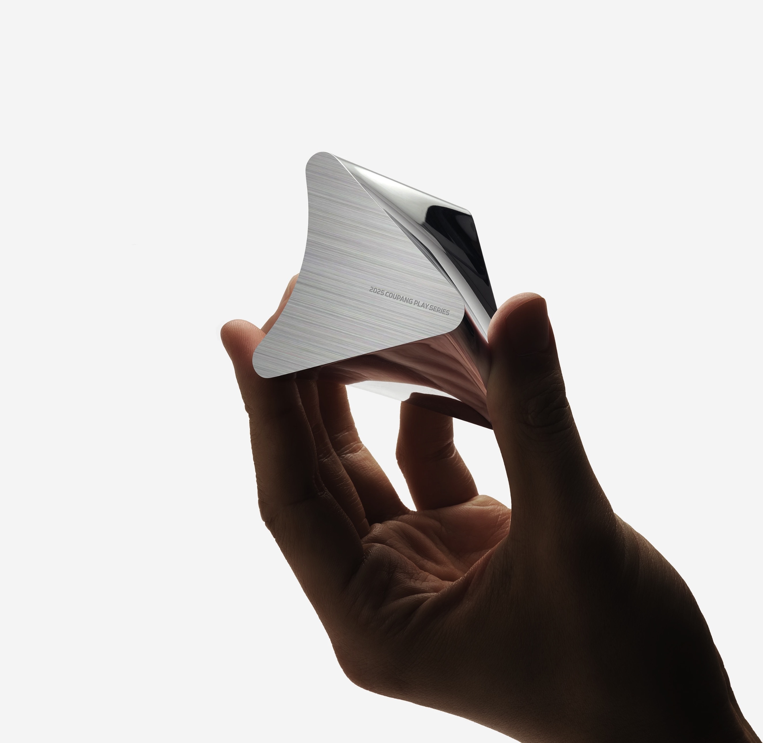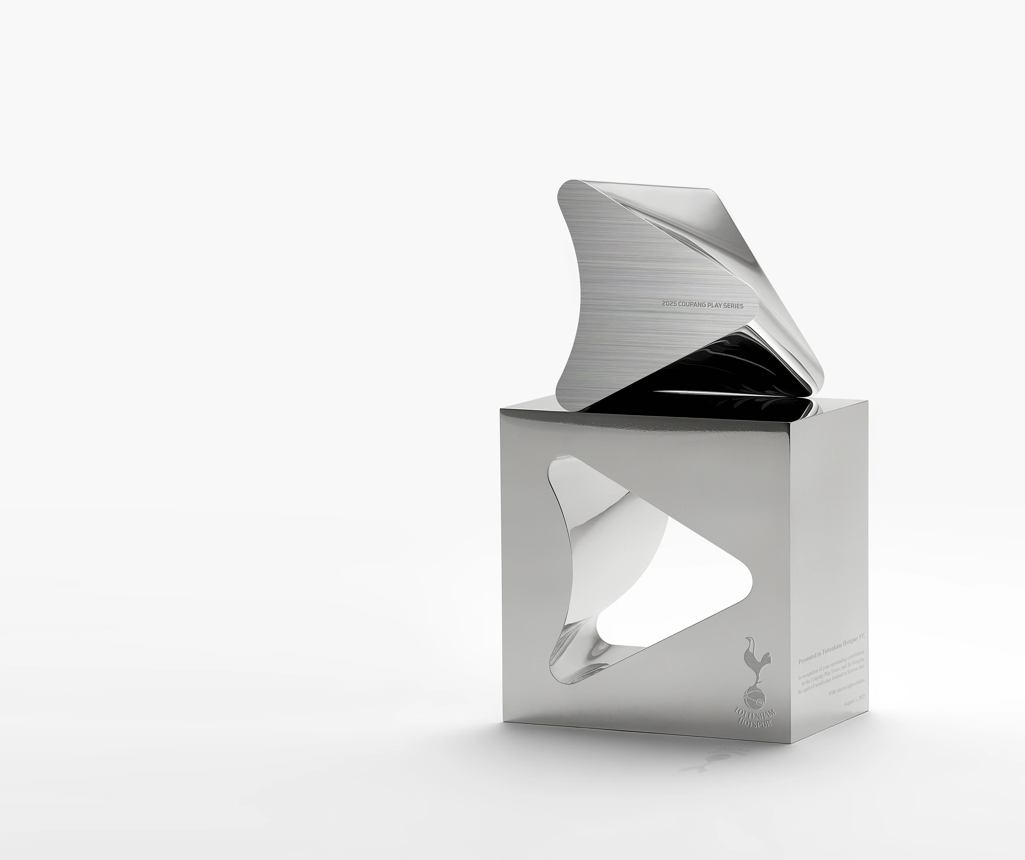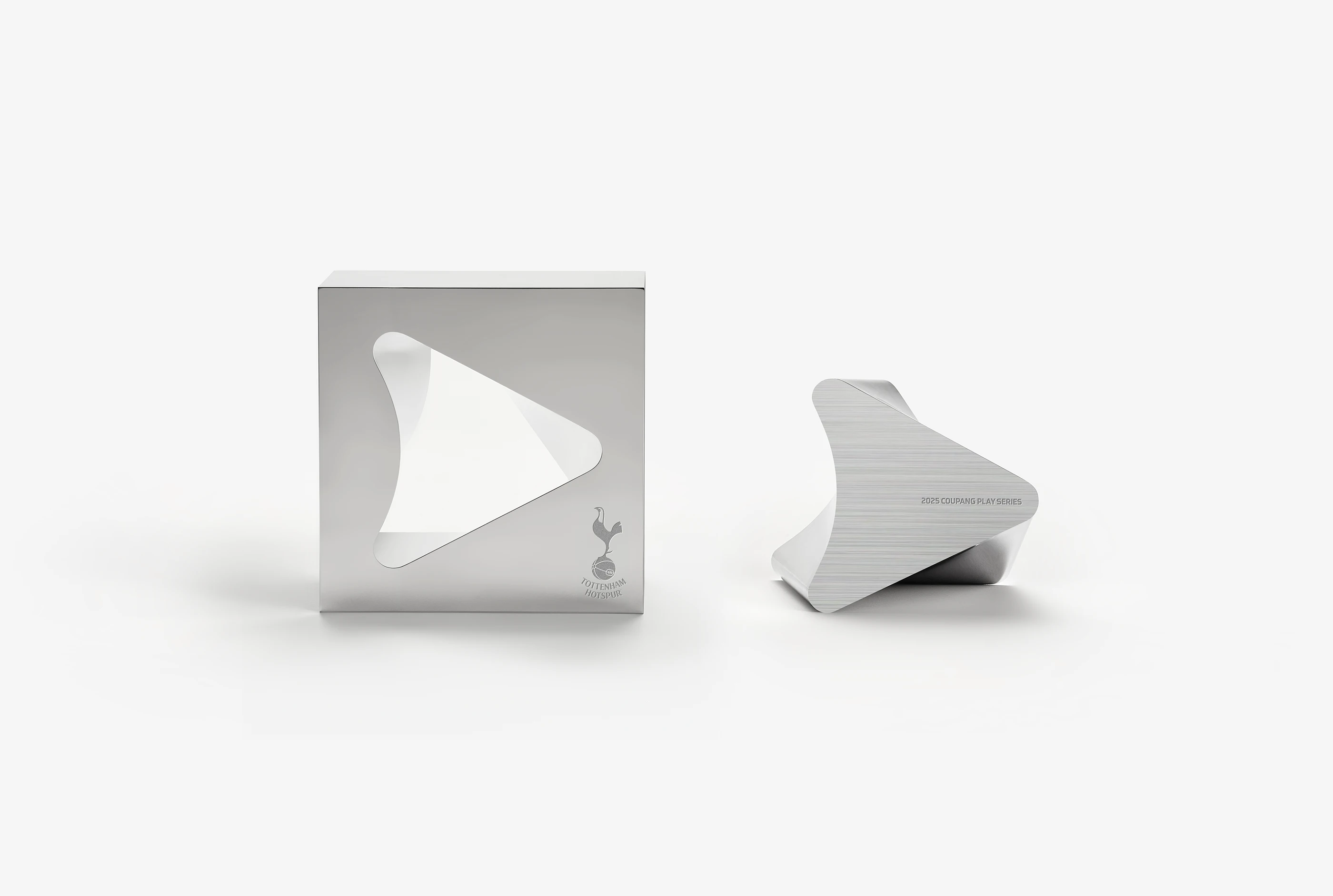 这组奖杯视觉物料全方位呈现了 2025 Coupang Play Series 奖杯的精工之美。主体由拉丝与抛光双质感的银色金属打造,流线型的三角雕塑造型极具现代感,镌刻 “2025 COUPANG PLAY SERIES” 字样;搭配镂空三角底座与热刺队徽,精准传达赛事身份。极简纯白背景与柔和光影,最大化凸显了金属的冷冽光泽与雕塑感,从手持、单座到多视角的展示,完美诠释了体育竞技的荣耀与北欧工业设计的极简高级感,是高端体育赛事与品牌联名的顶级视觉素材。