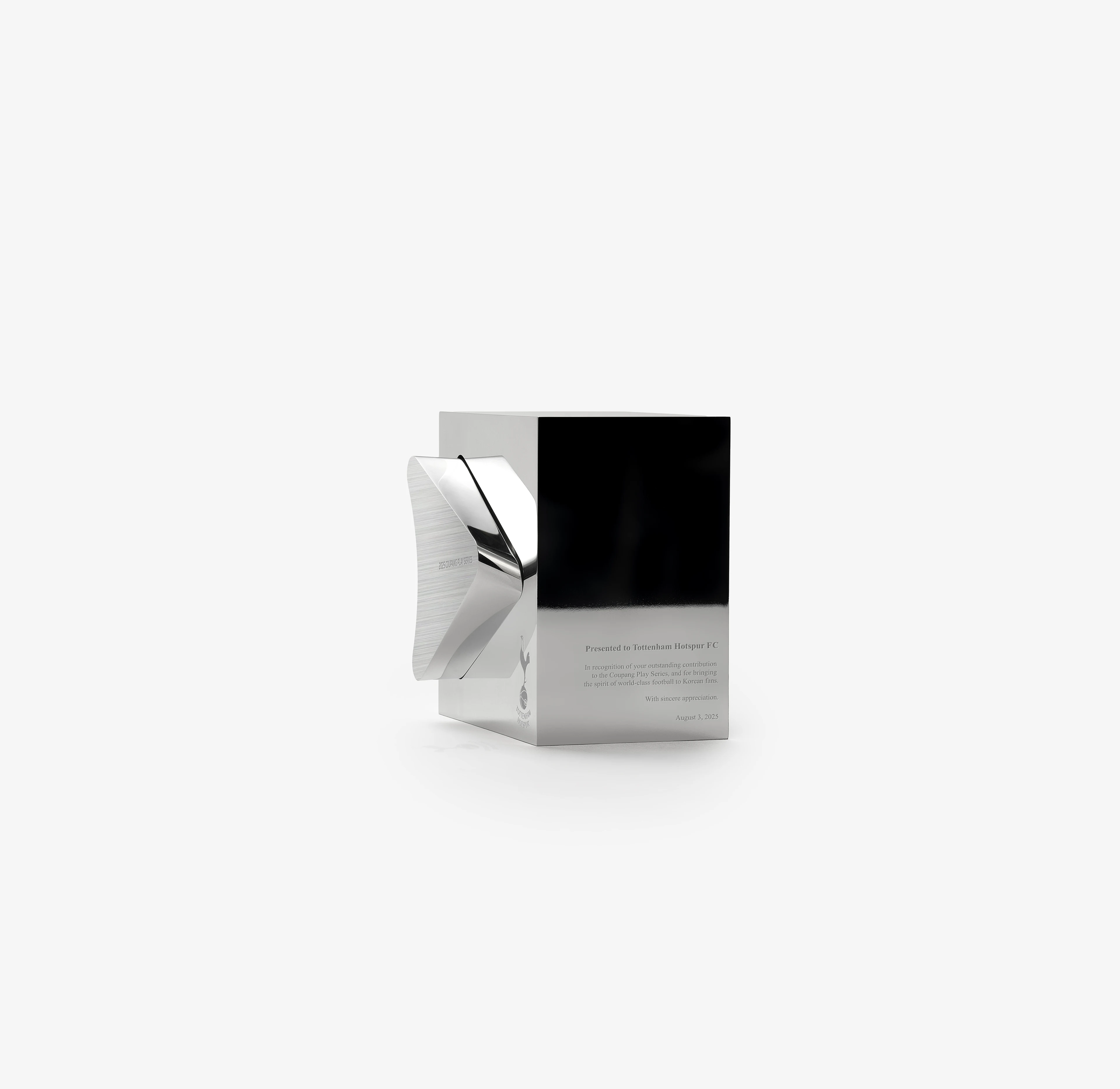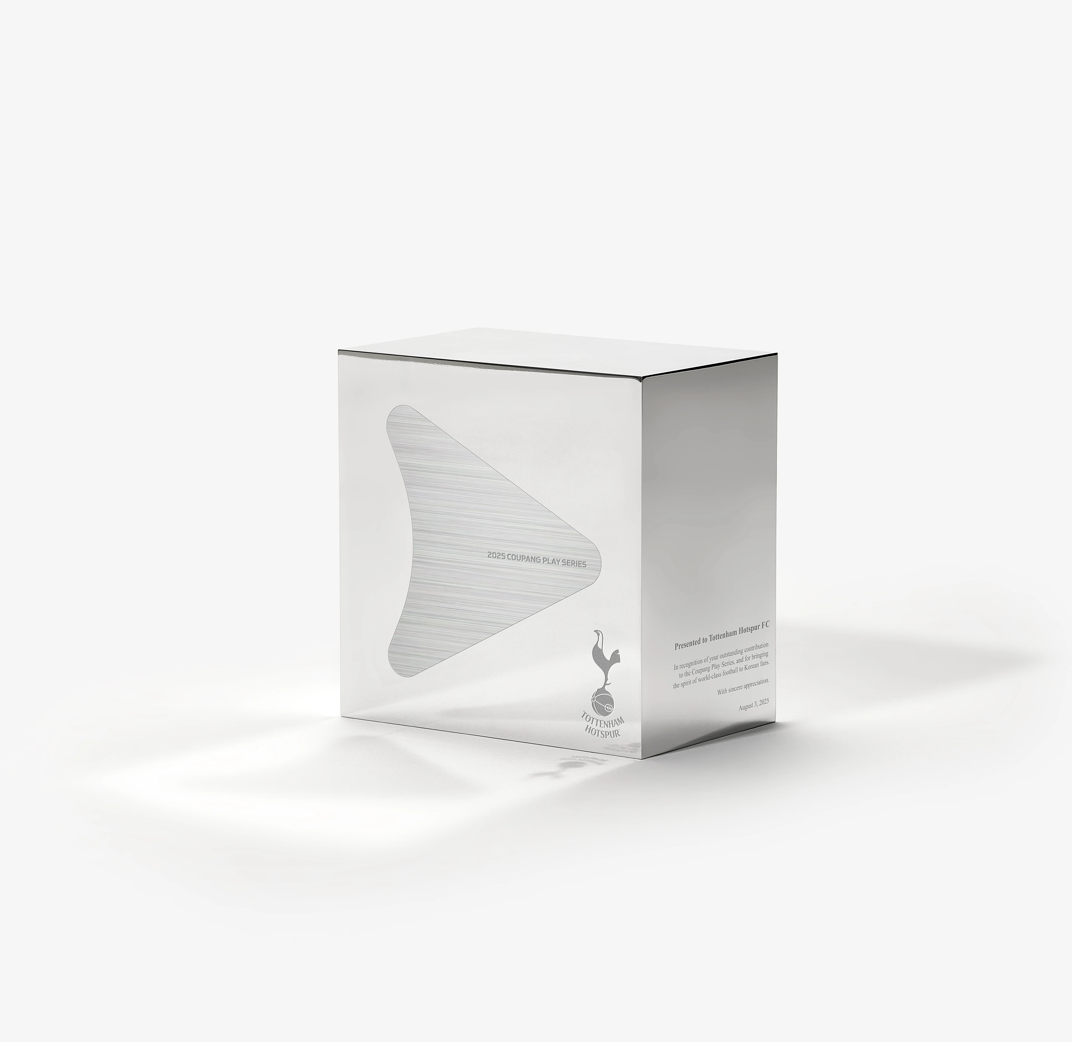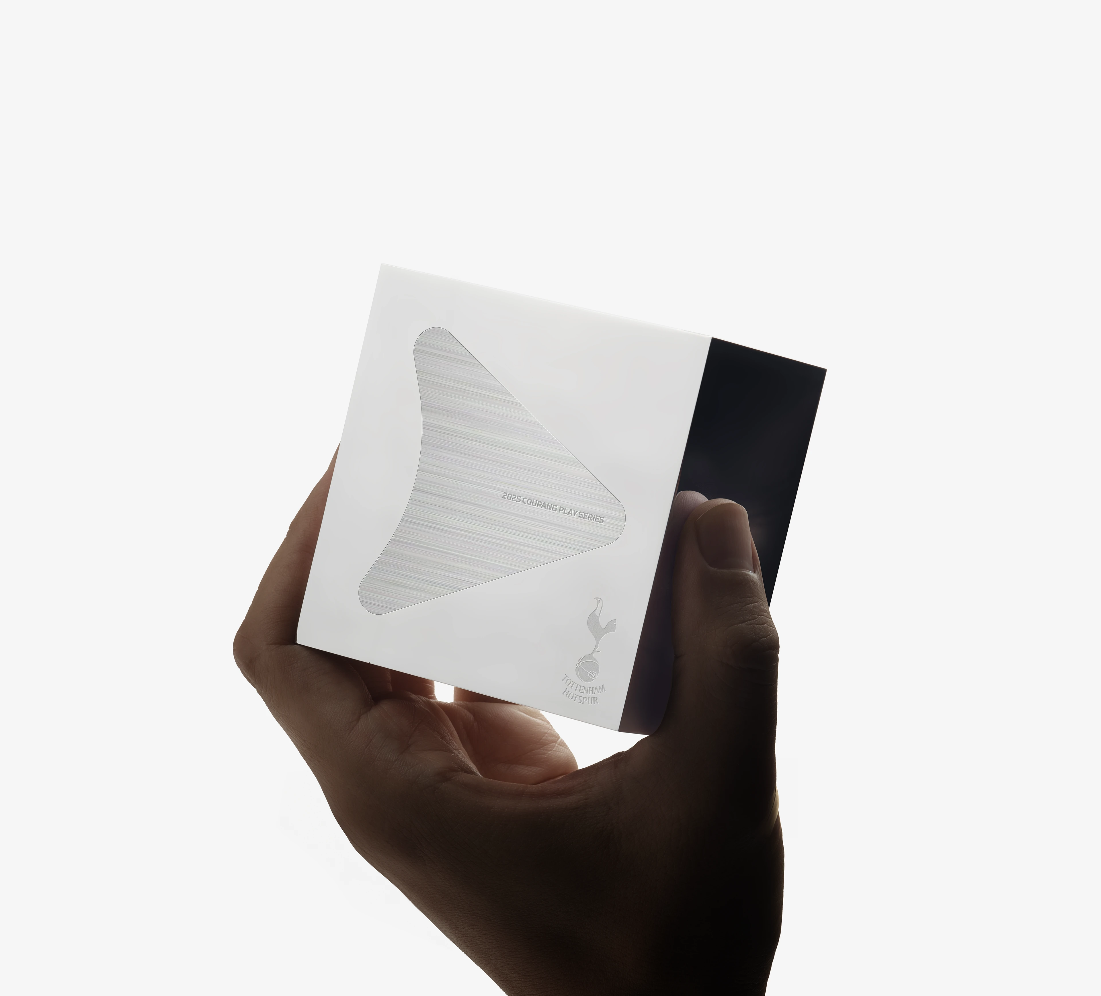 这组奖杯视觉物料全方位呈现了 2025 Coupang Play Series 奖杯的精工之美。主体由拉丝与抛光双质感的银色金属打造,流线型的三角雕塑造型极具现代感,镌刻 “2025 COUPANG PLAY SERIES” 字样;搭配镂空三角底座与热刺队徽,精准传达赛事身份。极简纯白背景与柔和光影,最大化凸显了金属的冷冽光泽与雕塑感,从手持、单座到多视角的展示,完美诠释了体育竞技的荣耀与北欧工业设计的极简高级感,是高端体育赛事与品牌联名的顶级视觉素材。