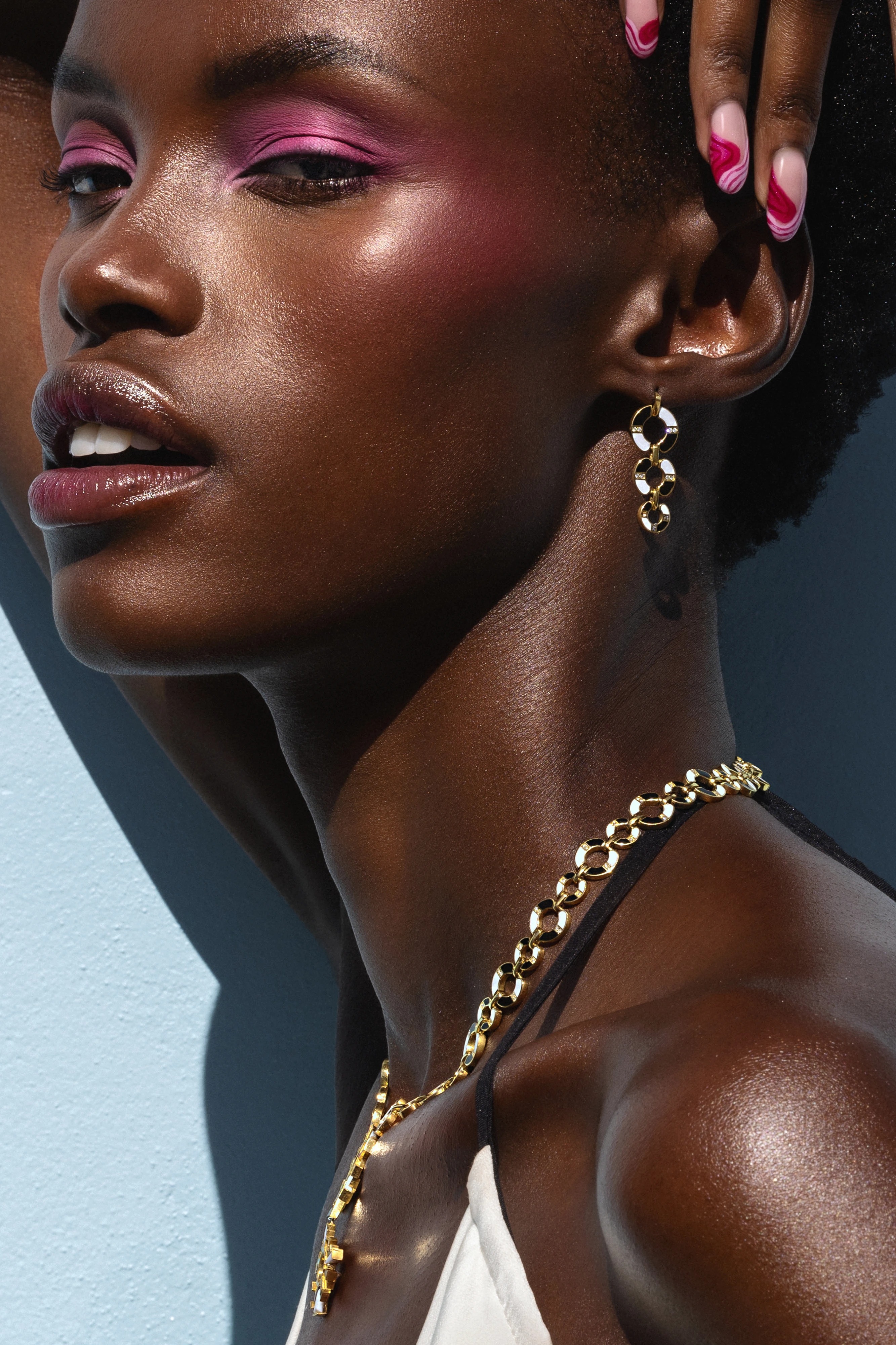 这组泳池边时尚摄影,以澄澈蓝天与碧蓝泳池为背景,完美呈现金饰彩宝的奢华质感。深棕肌肤与夏日清凉碰撞,彩宝项链、耳环、戒指等配饰色彩斑斓,搭配草莓特调鸡尾酒、几何感墨镜与精致美甲,光影斑驳间尽显热带度假的松弛与高级。画面色彩饱满,既展现了珠宝配饰的璀璨魅力,又传递出夏日泳池派对的时尚氛围,适配珠宝品牌宣传、时尚大片、视觉创作等多场景使用,是传递 “泳池时尚 | 金饰彩宝 | 夏日奢饰” 主题的优质视觉素材。