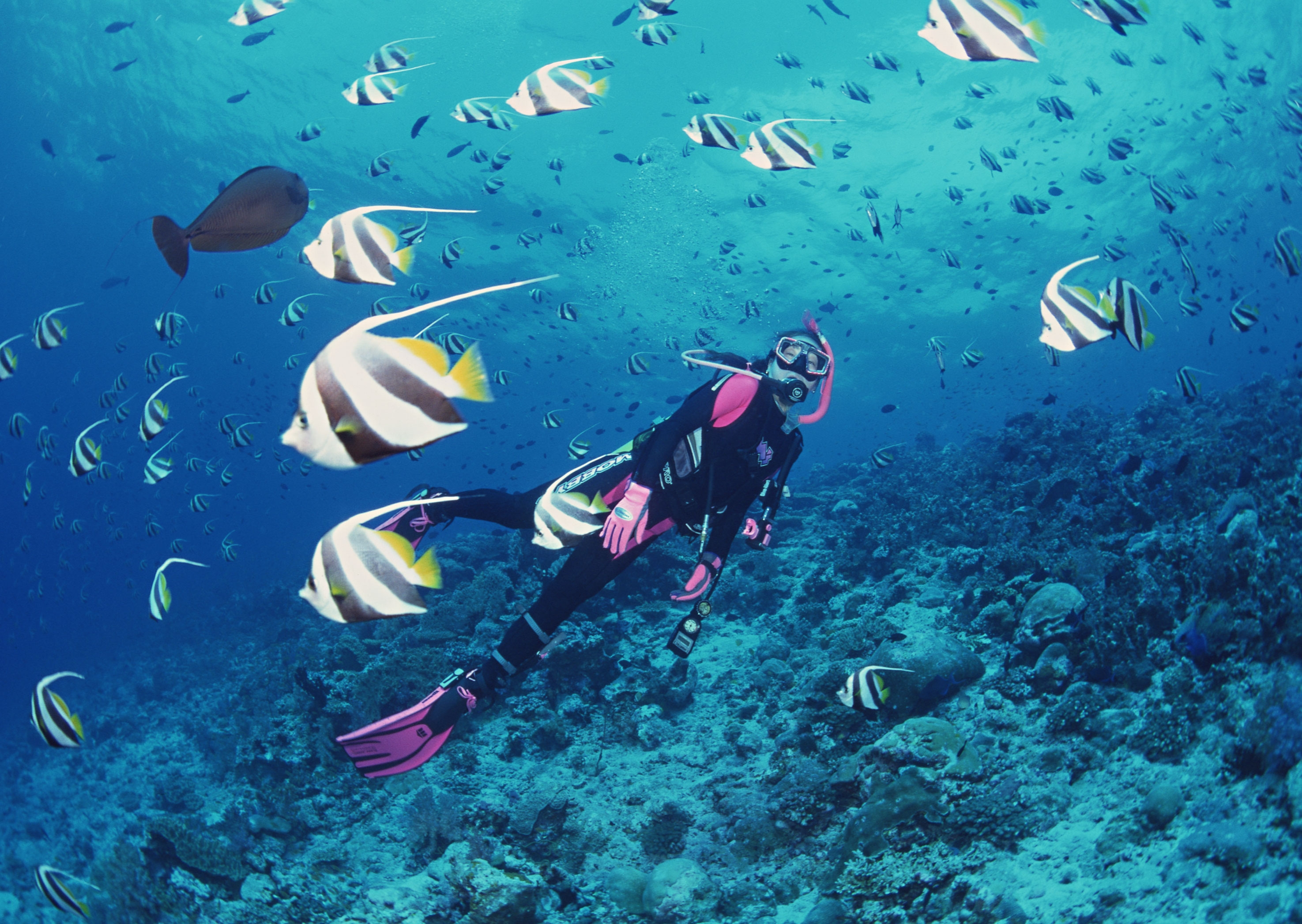 1 张 潜水员深海探秘群鱼壁纸