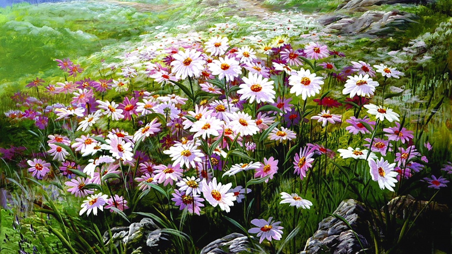 1 张 春天绿色草原白云山丘白色雏菊素材
