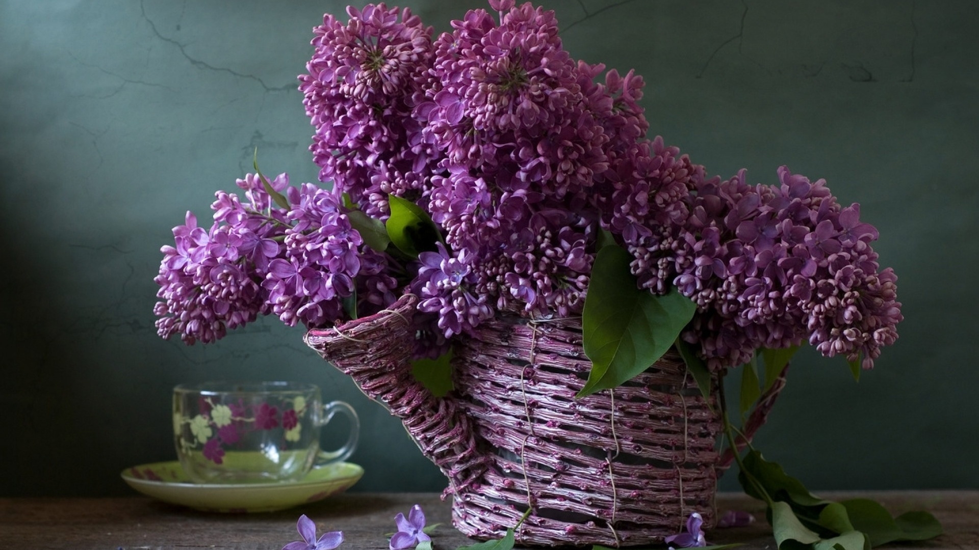 1 张 木桥上装满紫色欧丁香花瓣的竹篮子