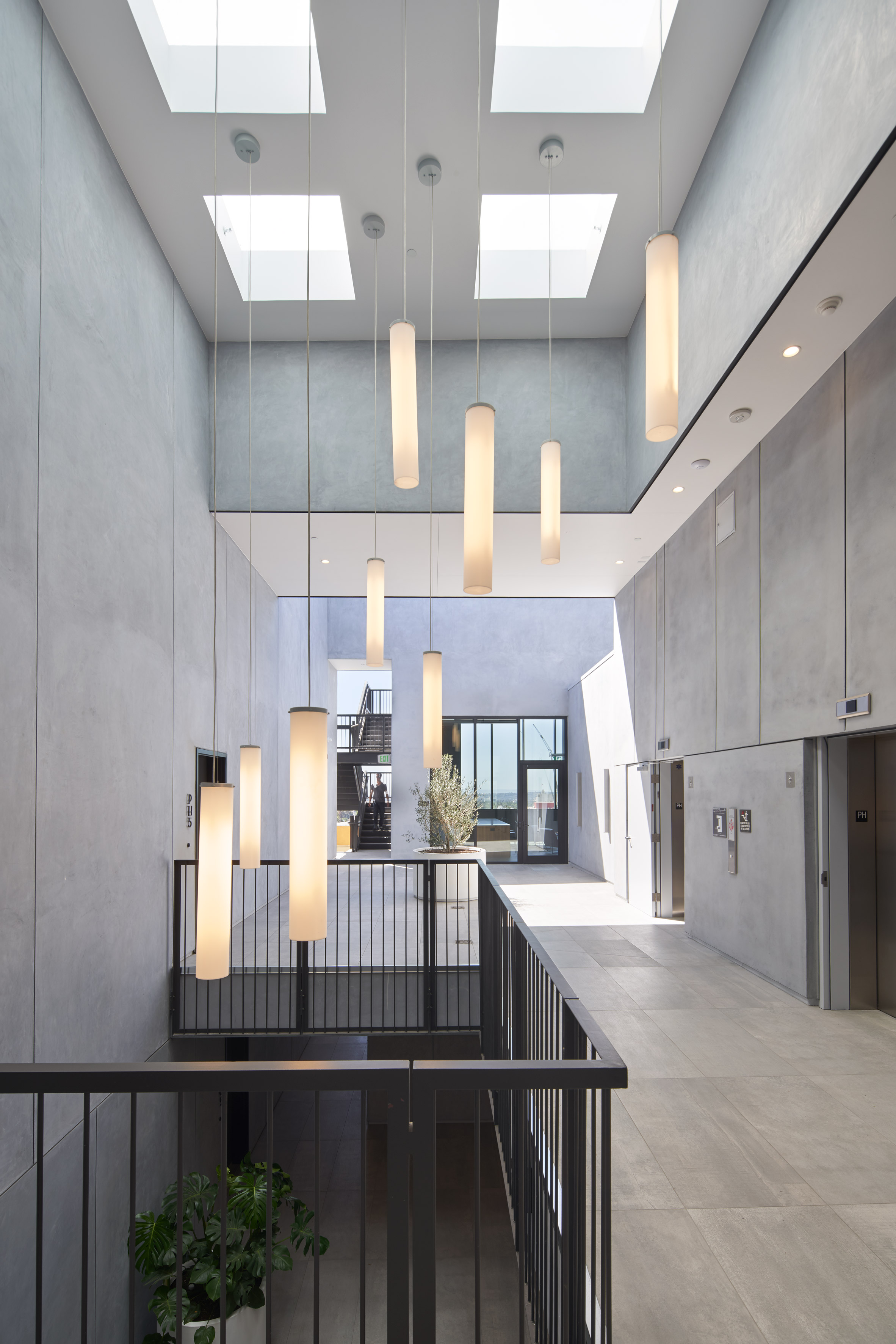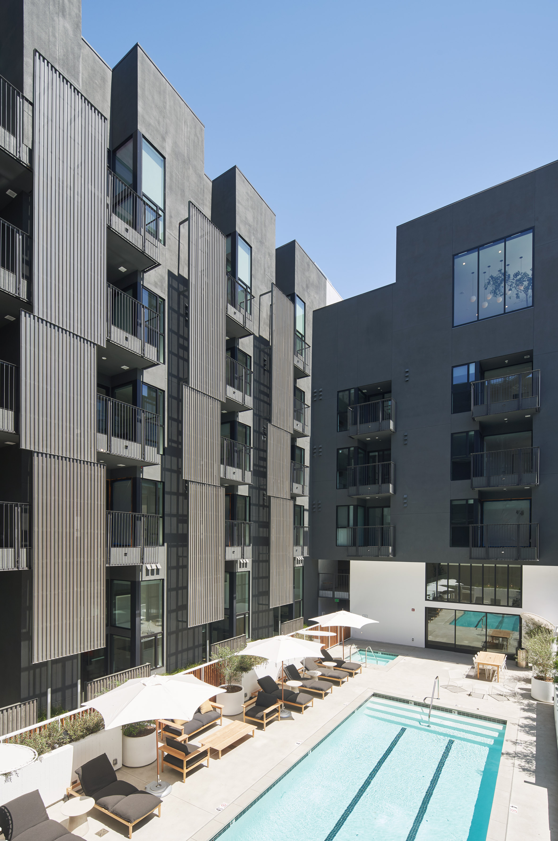 该建筑的82间公寓以优化景观和自然采光的方式进行布置。每个单元都有超大的窗户,玻璃滑块和嵌入式阳台。为了增加隐私,在面向庭院和街道的单元中增加了穿孔屏幕。