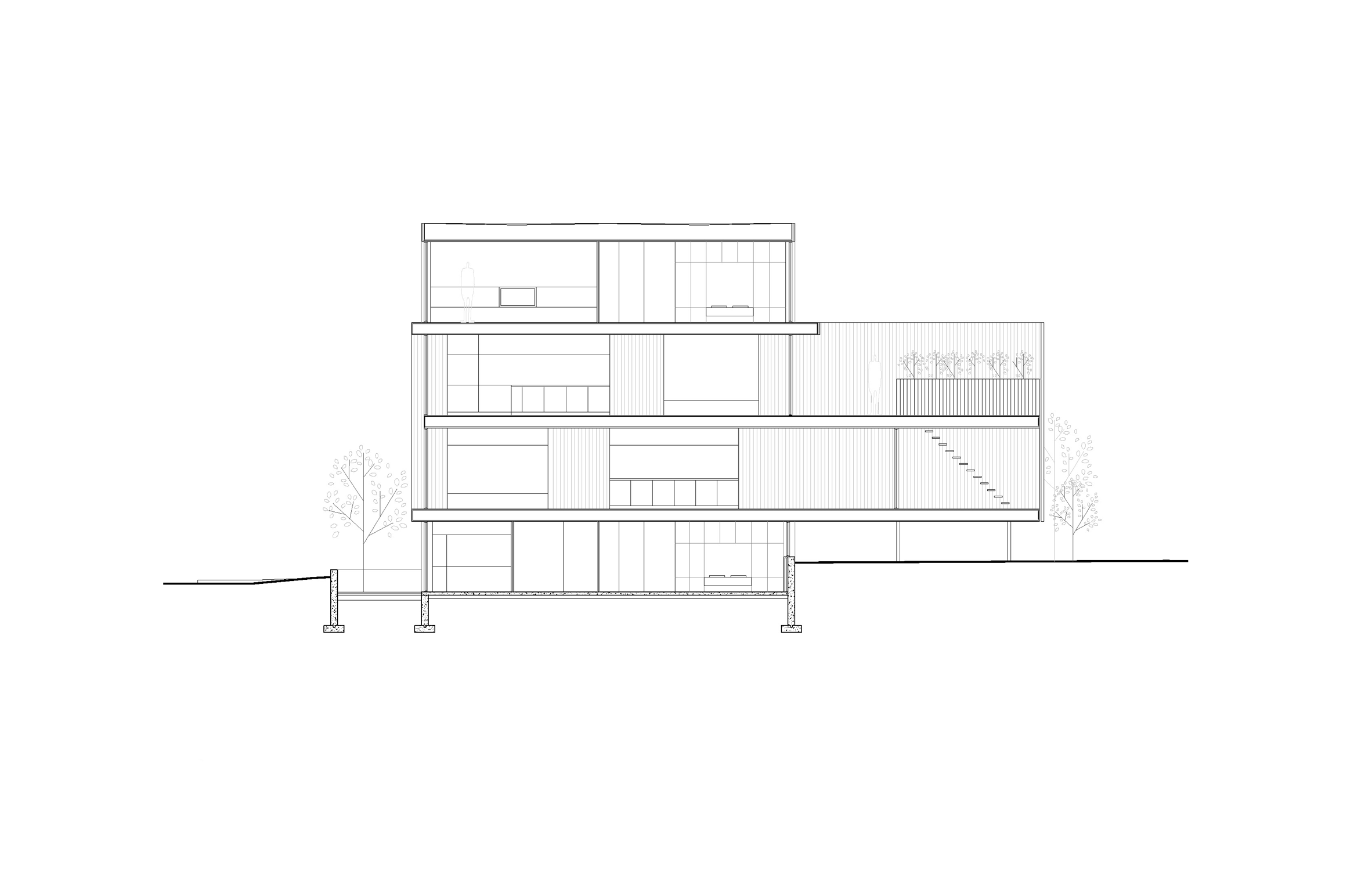 木制露台占据了建筑物后面的三层楼,为所有居民提供了户外空间。它由木质格子部分遮蔽,旨在为种植葡萄藤提供框架。