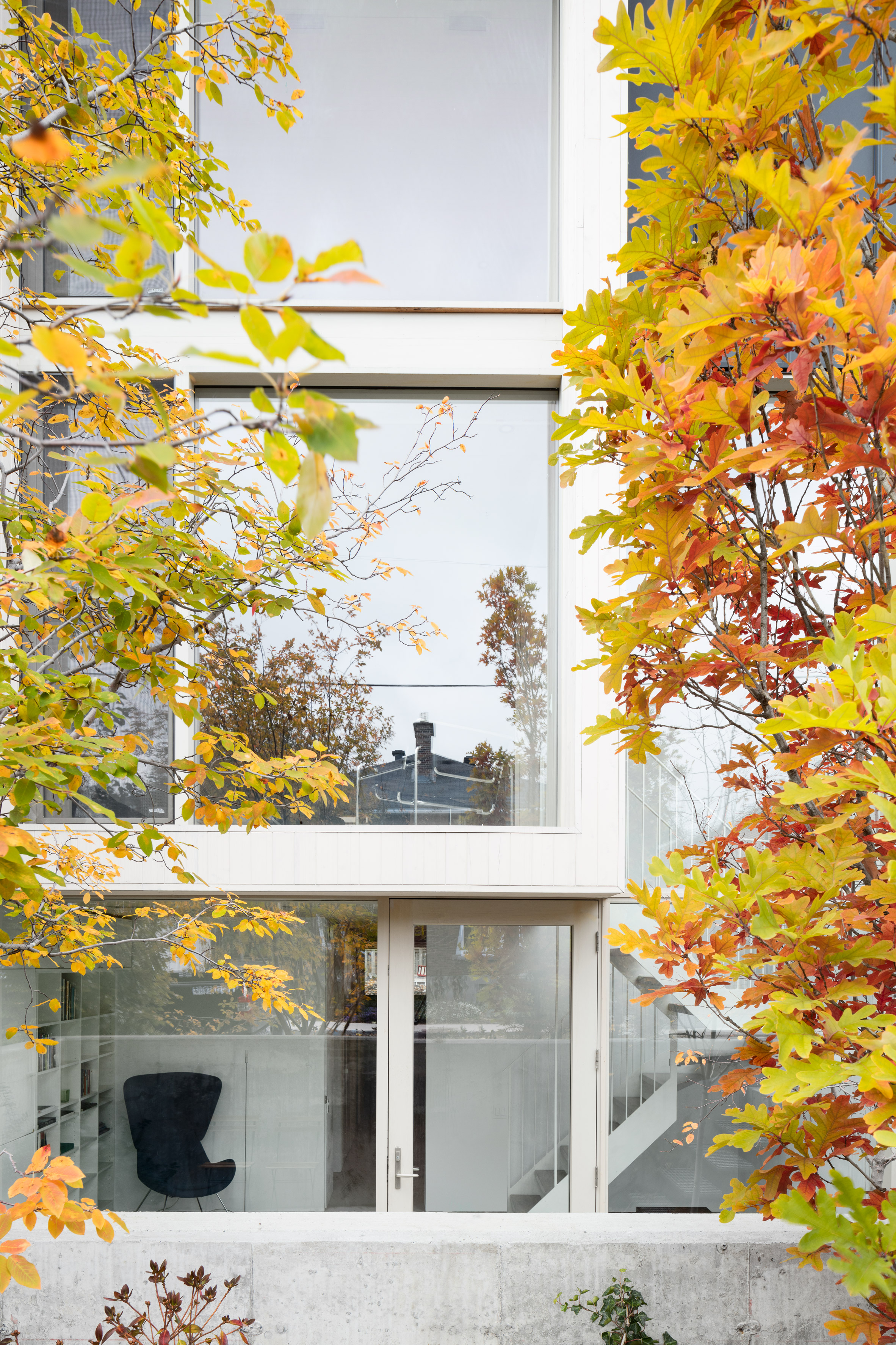 主入口通向一个开放式起居空间,包含厨房和用餐区。在家的前面,一个小型研究俯瞰下面的街道。