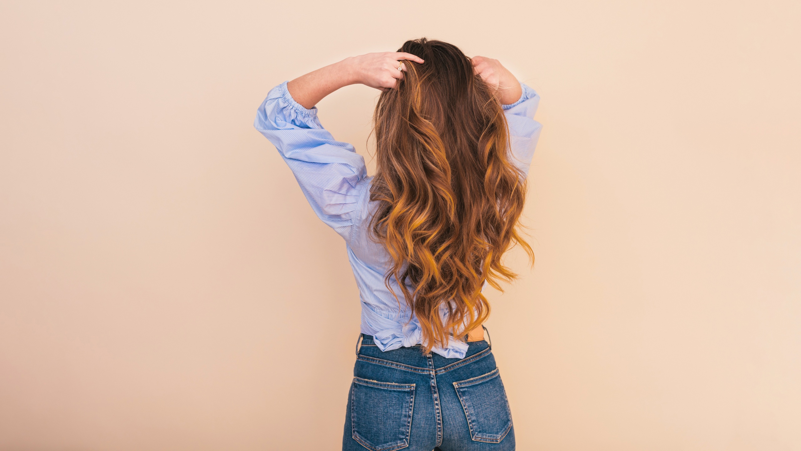 1 张 穿牛仔裤摸头发的女子