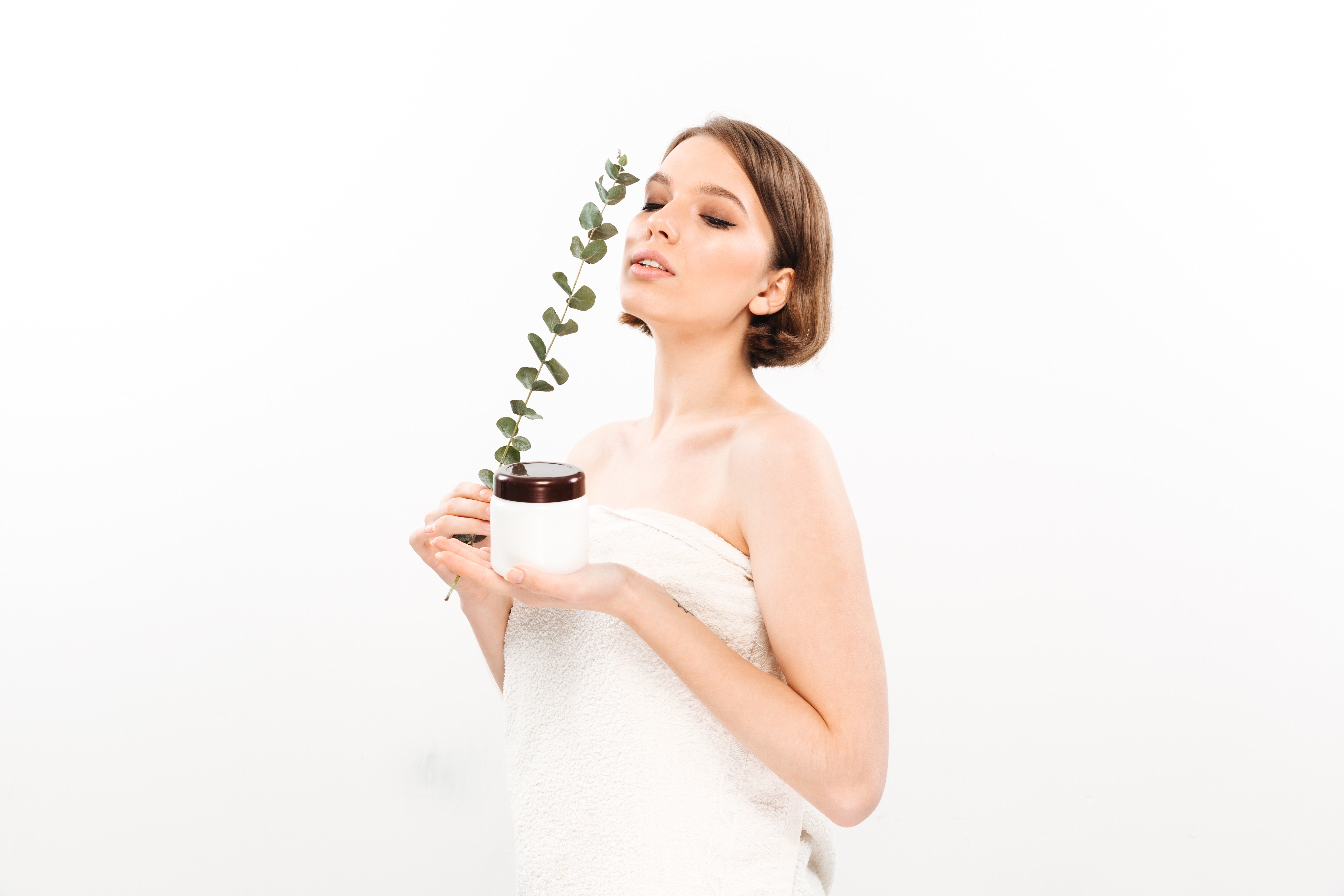 1 张 身穿白色浴袍手拿树叶护肤品的女郎