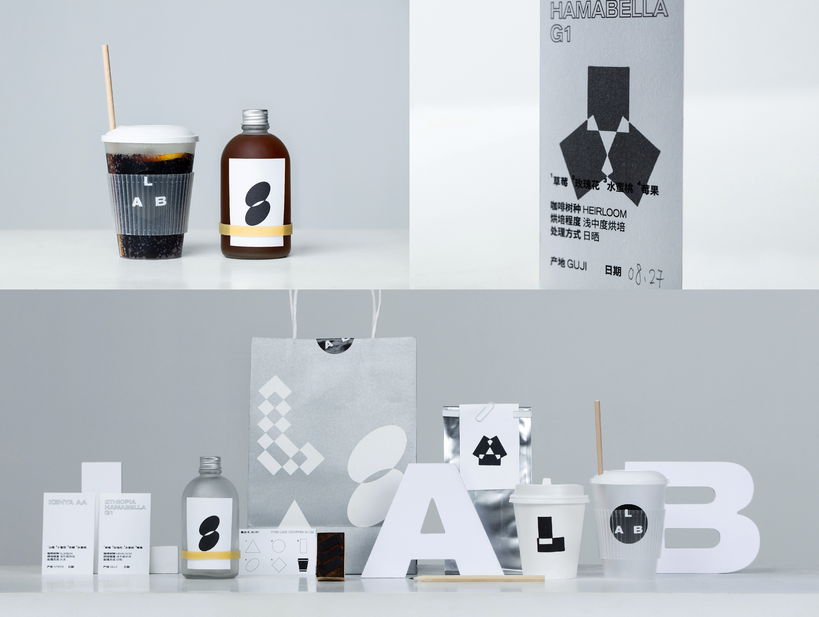 实验室咖啡是一家专注于咖啡味觉试验和体验的精品咖啡馆。为了把咖啡本身的体验放在首位,我们将品牌标志与名字弱化,转而设计了一套服务于咖啡冲泡方式以及味觉和嗅觉感受的图形做为实验室咖啡的视觉识别系统。这套图形的构成方式以黑白交错的语言为主,呼应相融、排斥等实验主题,通过视觉与味觉、嗅觉的关联,多维度的向受众传递咖啡与咖啡豆的特性。