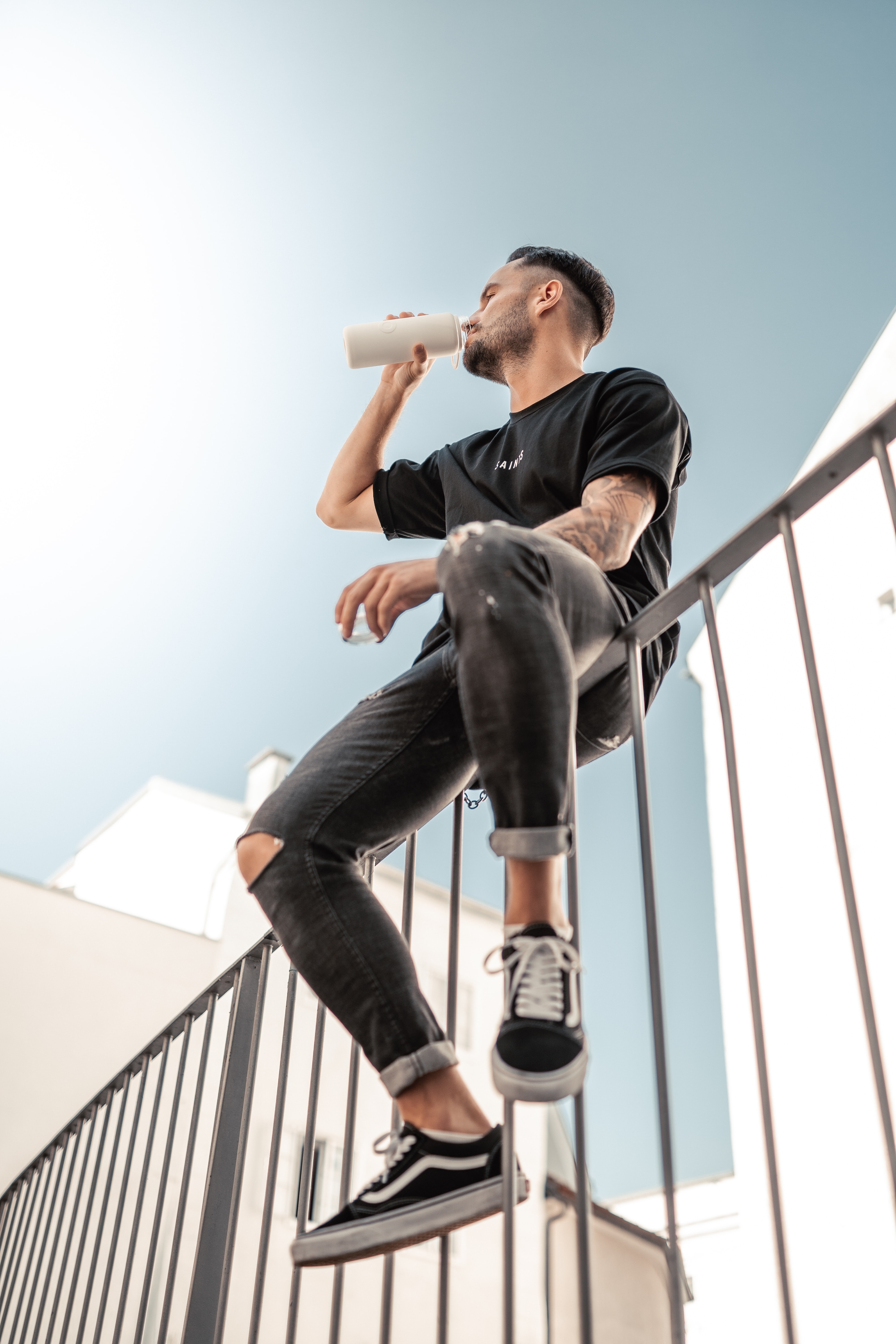 1 张 坐在栏杆上喝水的男子