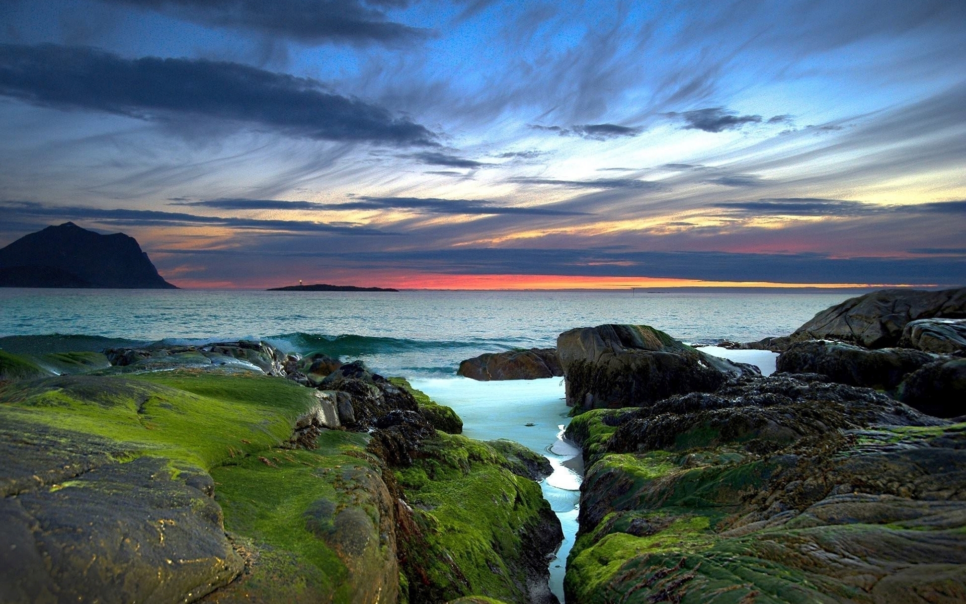 1 张 粉红色的日落下的长满青苔的岩石海洋 : 949879