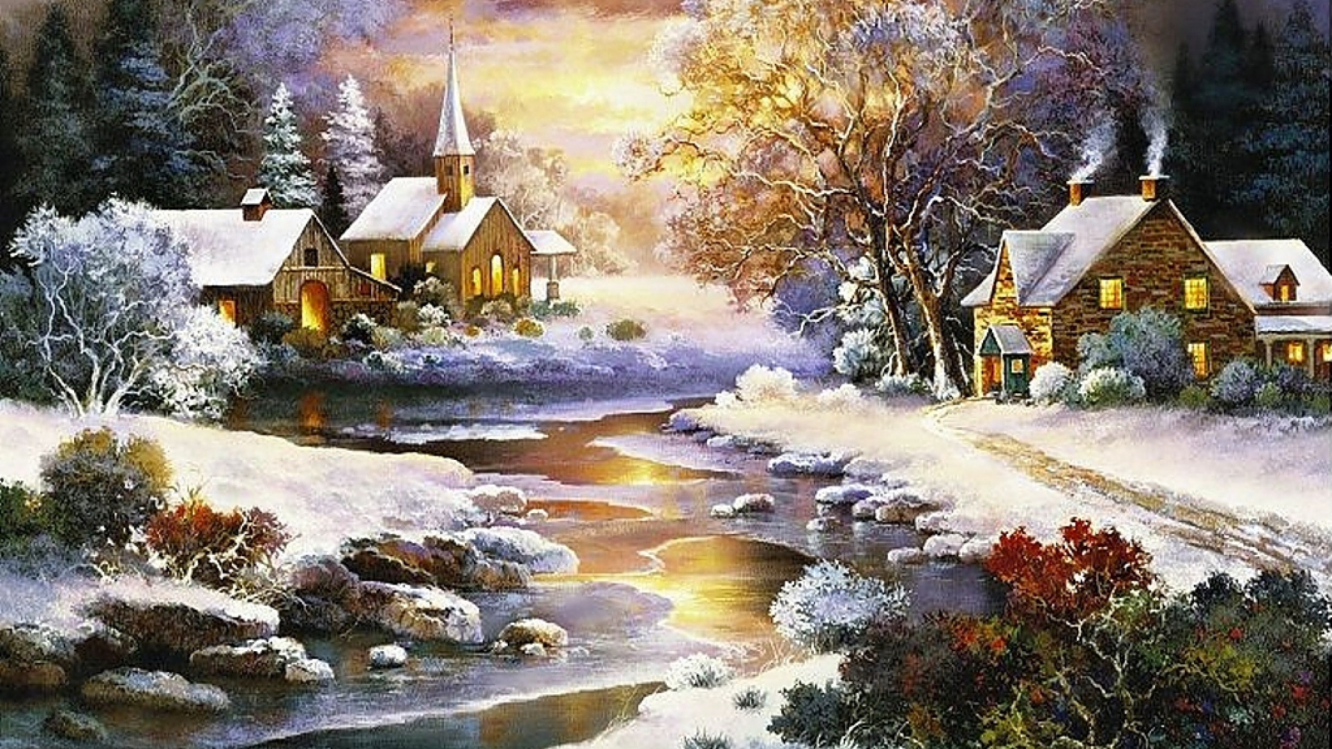 1 张 高清晰秋天的森林小溪油画壁纸 : 938942