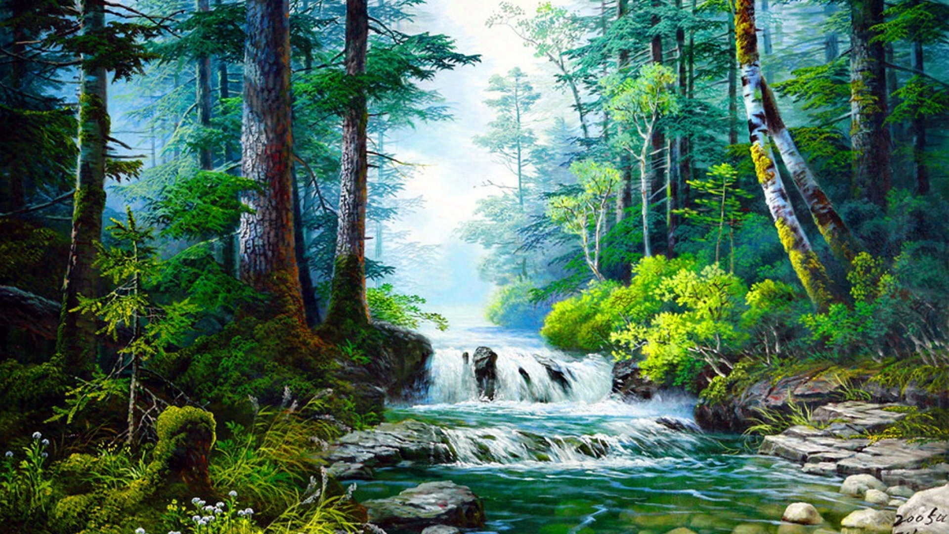 1 张 明亮的绿树小溪壁纸 : 955118