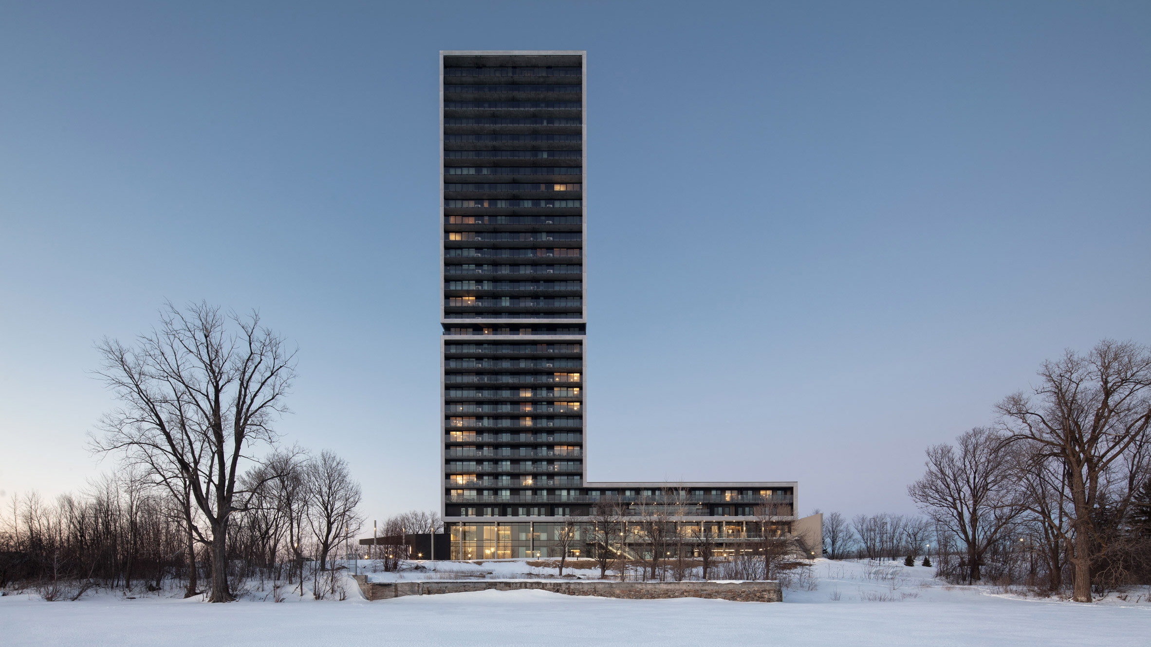 长长的玻璃阳台和黑暗的窗户沿着Panorama的南北立面延伸,而不同灰色阴影的预制混凝土板覆盖了建筑的东西立面。