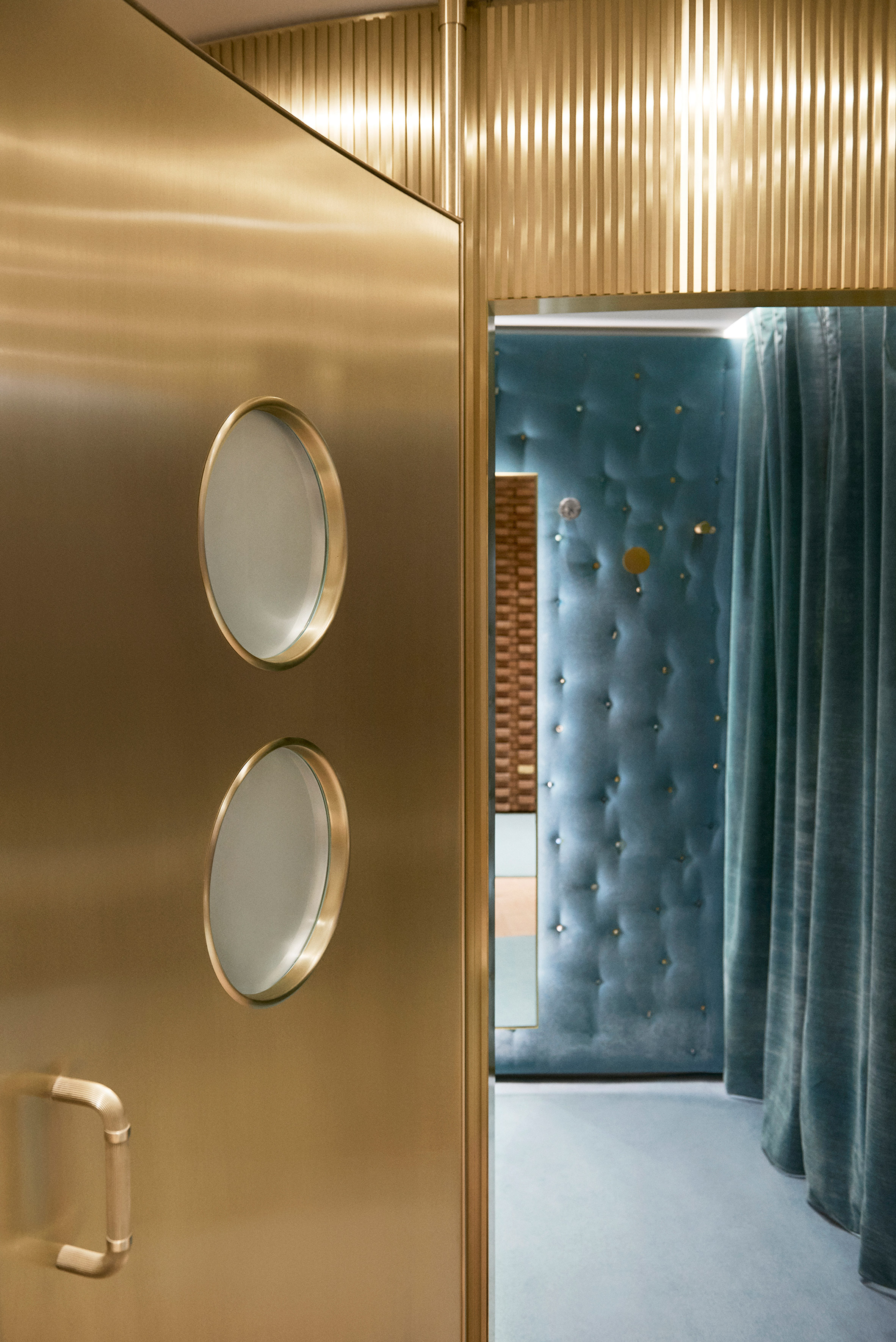 金黄色的金属还被用来制作巨大的带槽的门,可以进入更衣室。在里面,他们已经完成了缓冲墙和沉重的蓝色天鹅绒窗帘的装饰,像闺房一样受欢迎