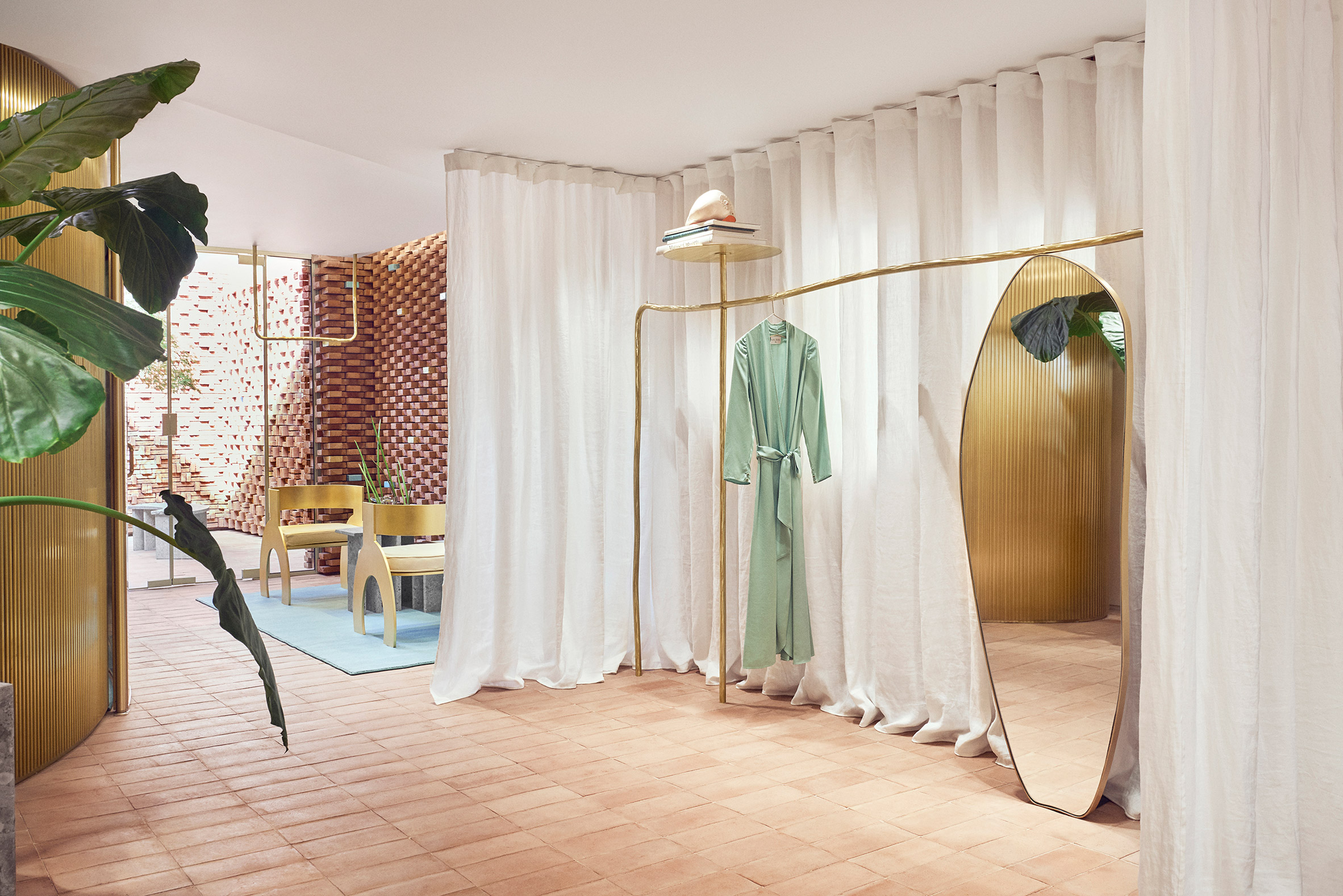 为了给视觉和彩色旋律增添“令人惊讶的触感”,墙上还点缀了一些开裂的绿松石陶瓷砖以及一些金箔砖