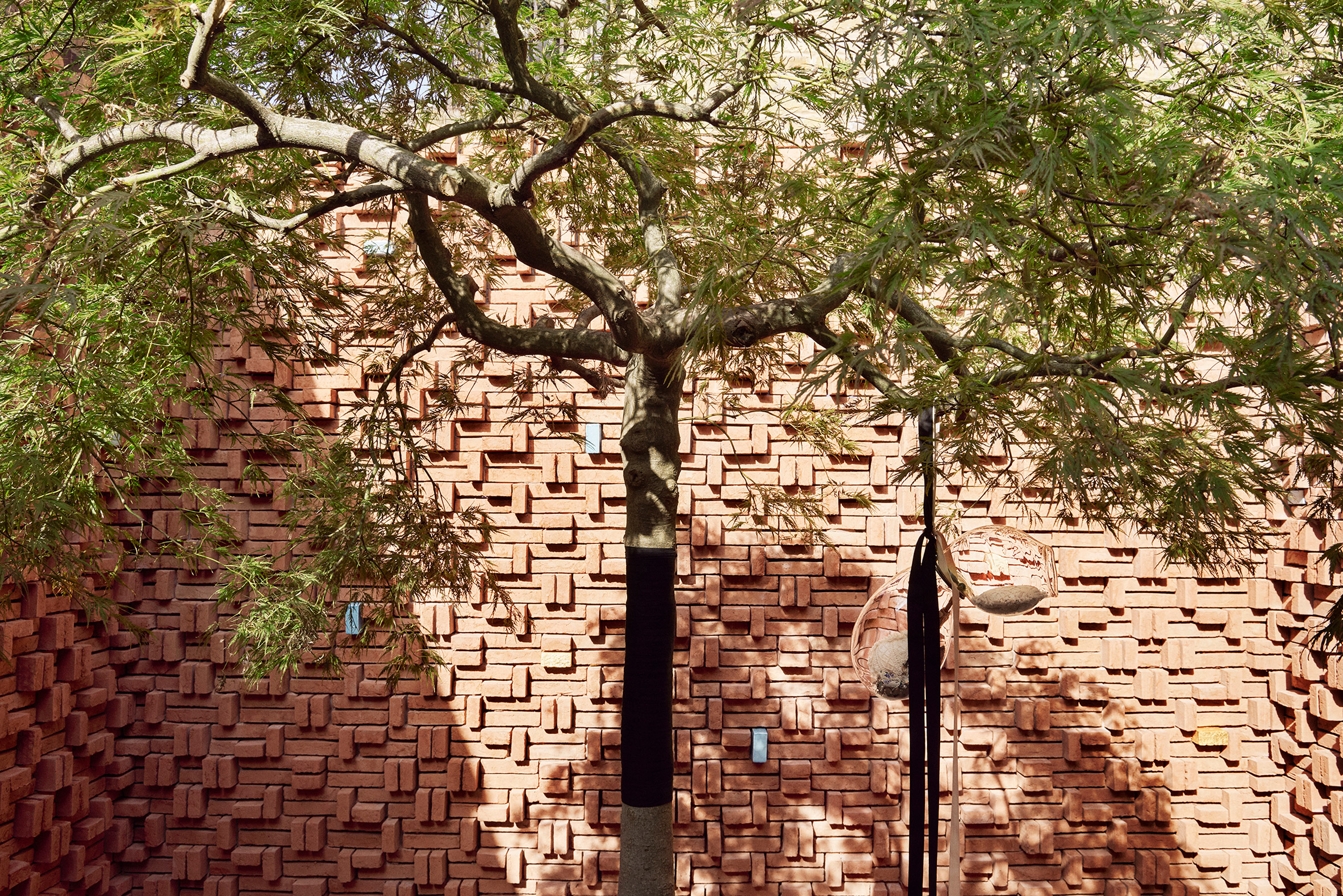在某些区域中,砖块是平放的,而在另一些区域中,砖块是水平和垂直堆叠的,以产生几乎像素化的表面效果