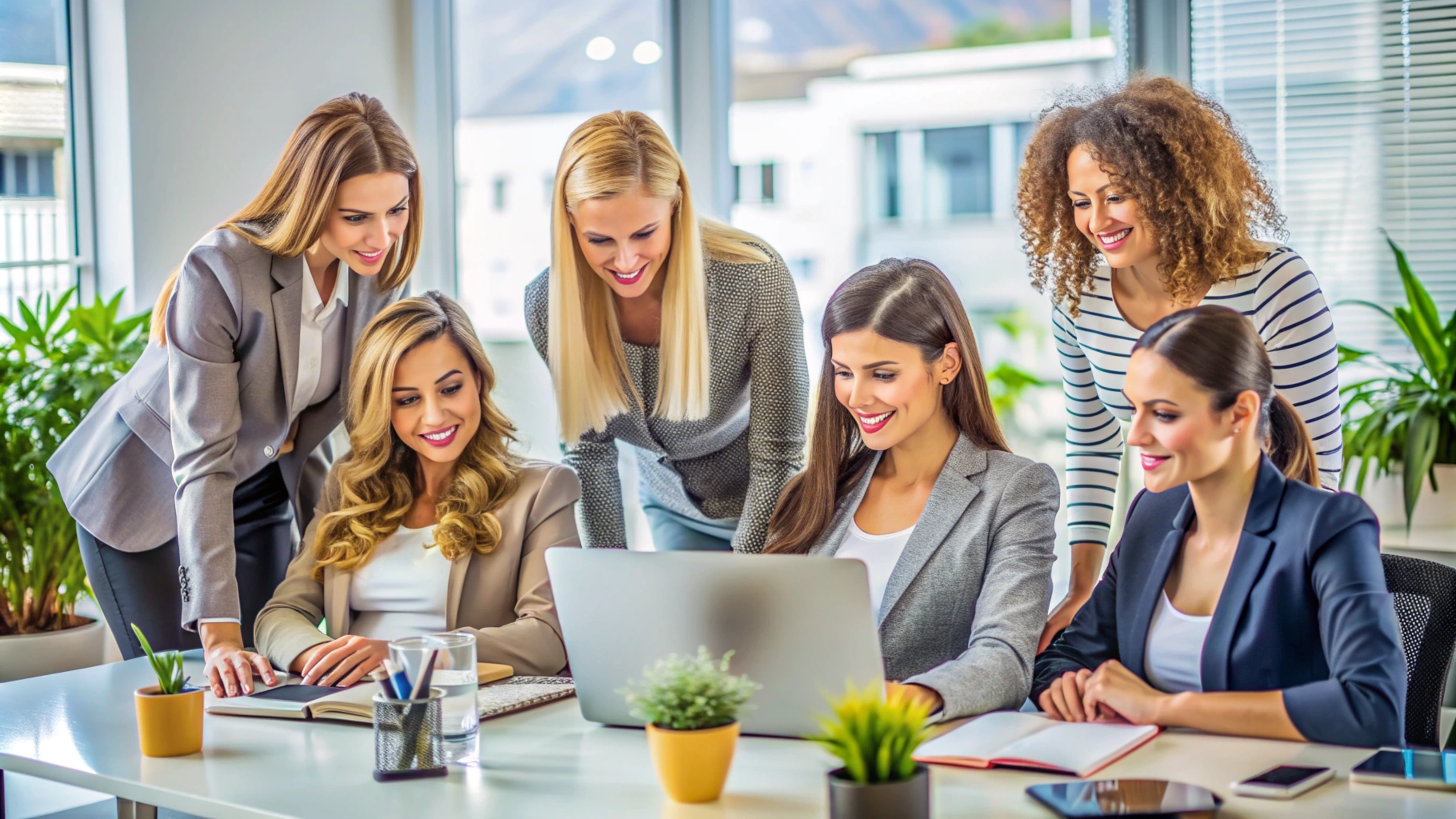 6 张 六张聚在一起打开笔记本电脑开会讨论的女性白领图 : 1012936
