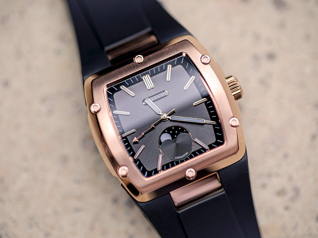这款手表采用桶形的Tonneau表壳,与当今每一款科技手表上看到的方形和圆形表壳不同。表壳配有一个由优质316不锈钢制成的旋入式表圈,在手表的径向拉丝面周围形成了一个边界。脸上还有一个精确的30天月相跟踪器,位于6点钟位置,准确显示了月球的4个相位:新月、第一季度、满月和最后一季度。表盘上的发光标记以及时针和分针让您在黑暗中看到时间,一个华丽的闪电形秒针在白天闪烁,为您的计时增添了活力