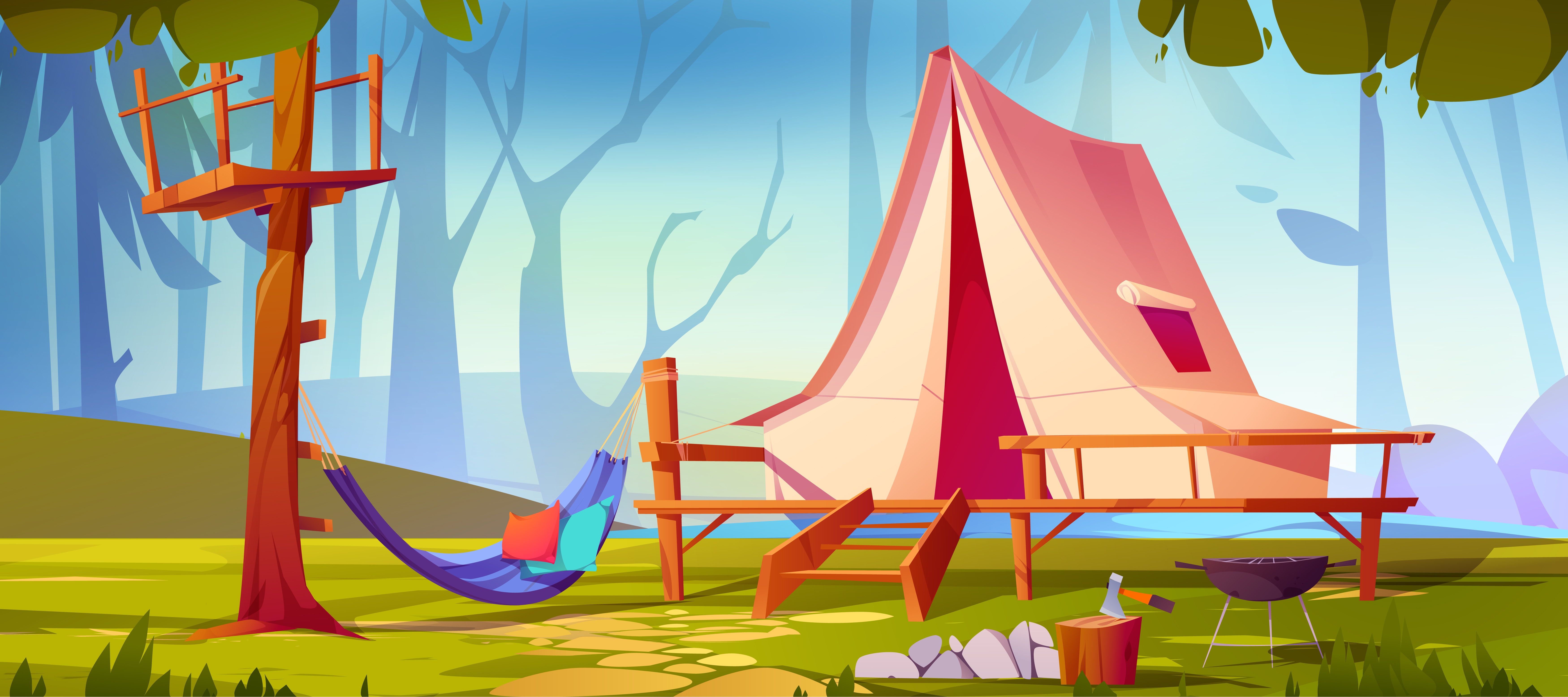 1 张 绿色卡通户外露营帐篷溪流风景素材
