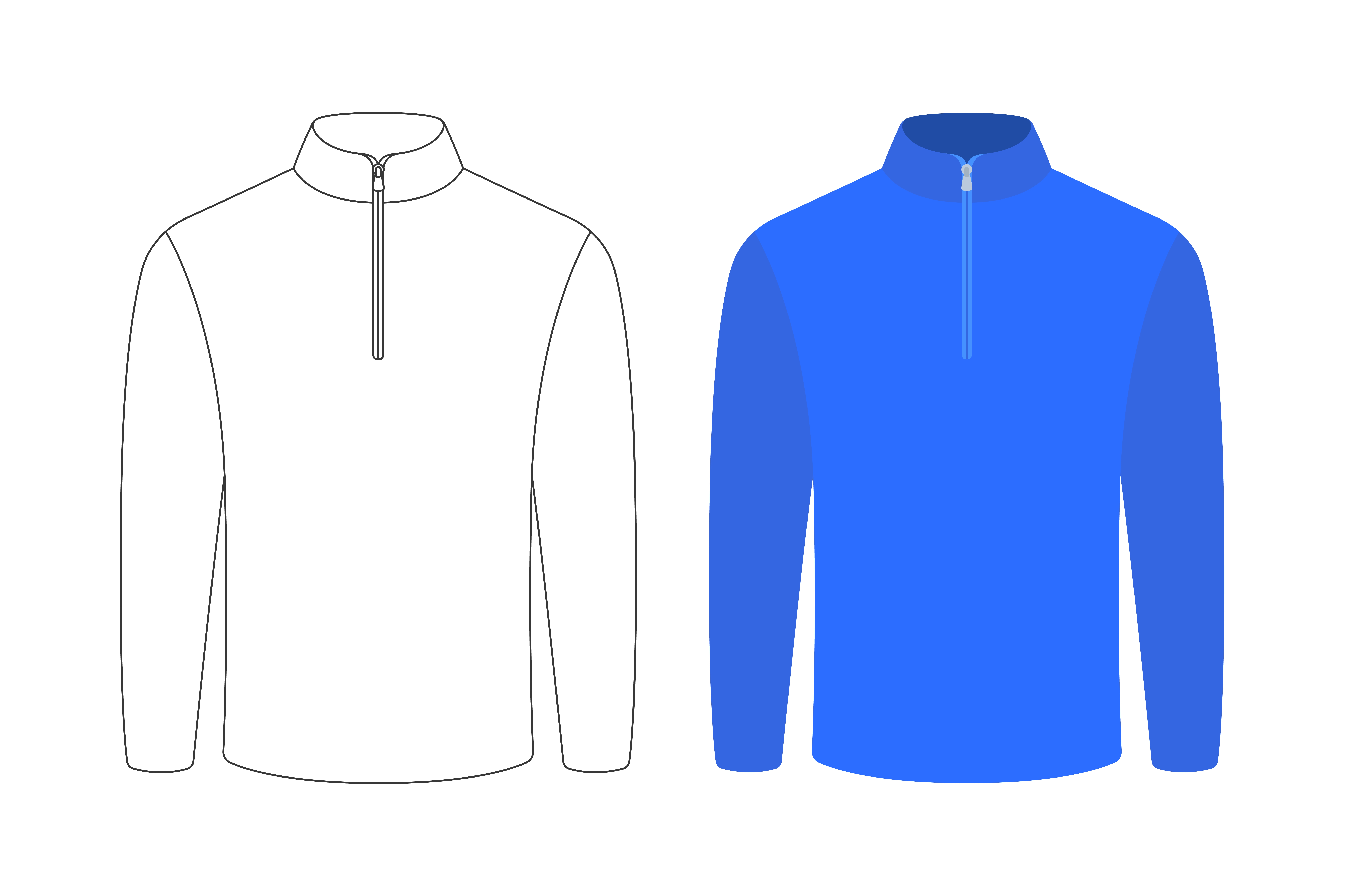 1 张 半拉链立领长袖上衣款式图:线稿与蓝色样衣的服装设计展示