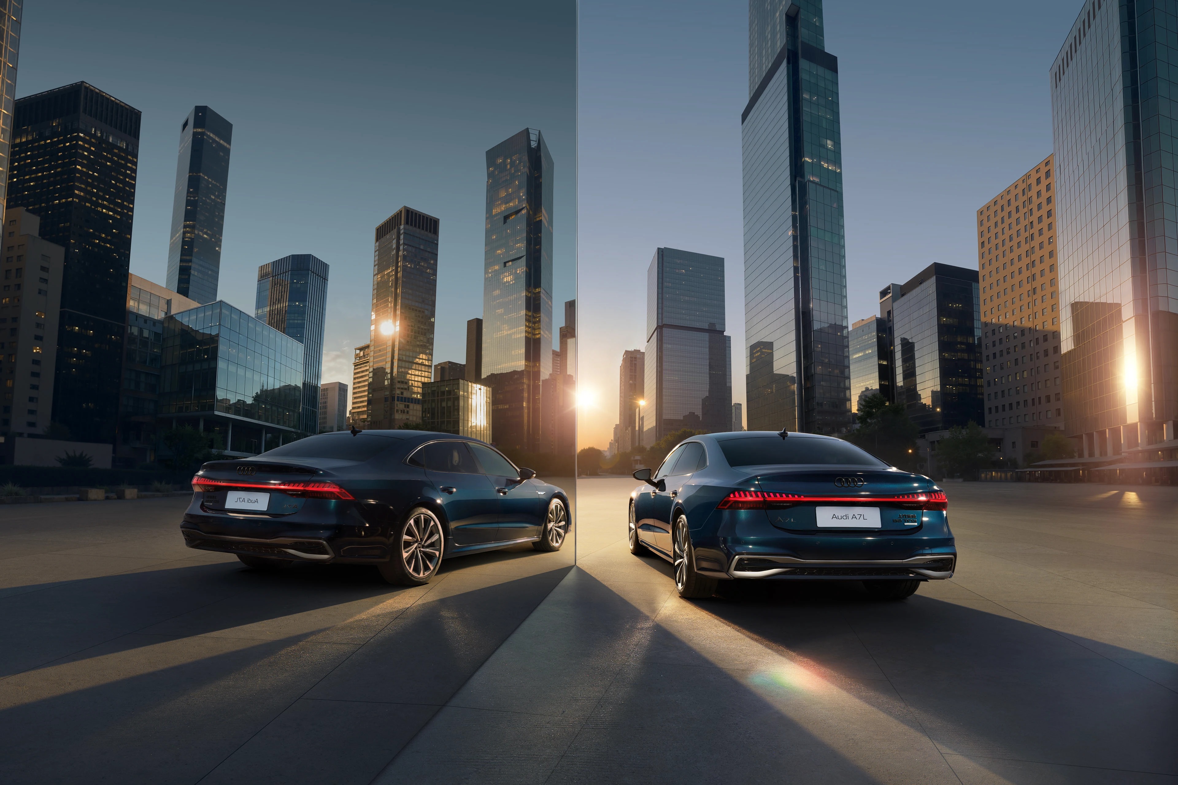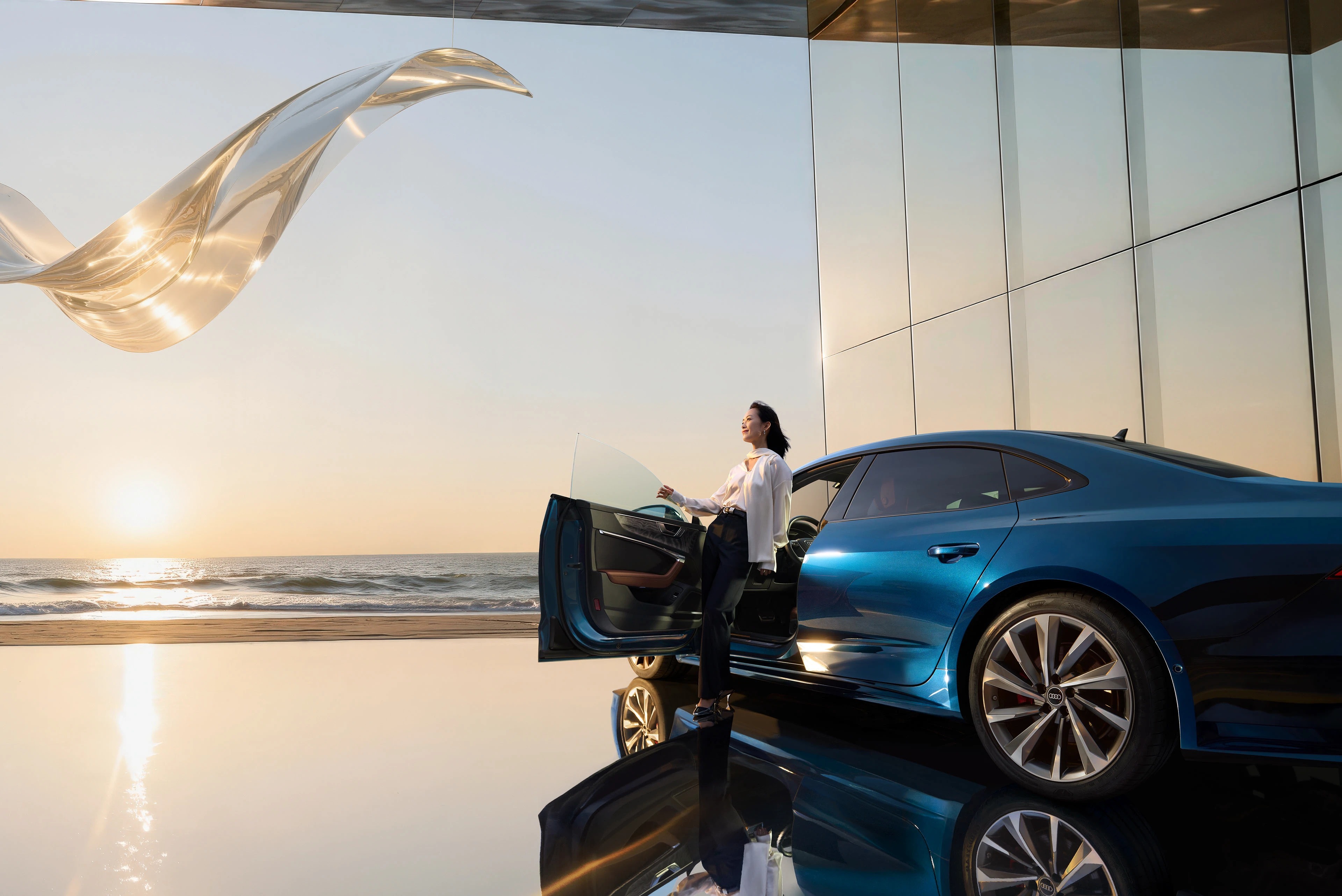 这是奥迪 A7L 车型的一组品牌视觉大片,以海滨日落为背景,结合现代建筑与悬浮的透明艺术装置,营造出奢华且充满未来感的氛围。深邃的车身蓝调在镜面地面与落日余晖的映衬下,凸显出溜背造型与流线型车身的优雅质感。人物舒展的姿态强化了 “优雅出行” 的产品调性,既展现了奥迪 A7L 的豪华设计与科技属性,也通过 “海滨 + 艺术 + 建筑” 的场景组合,传递出车型适配高端生活方式的定位。这类视觉作品常用于品牌宣传、线下展陈及社交媒体推广,是汽车营销中 “场景化美学表达” 的典型呈现。