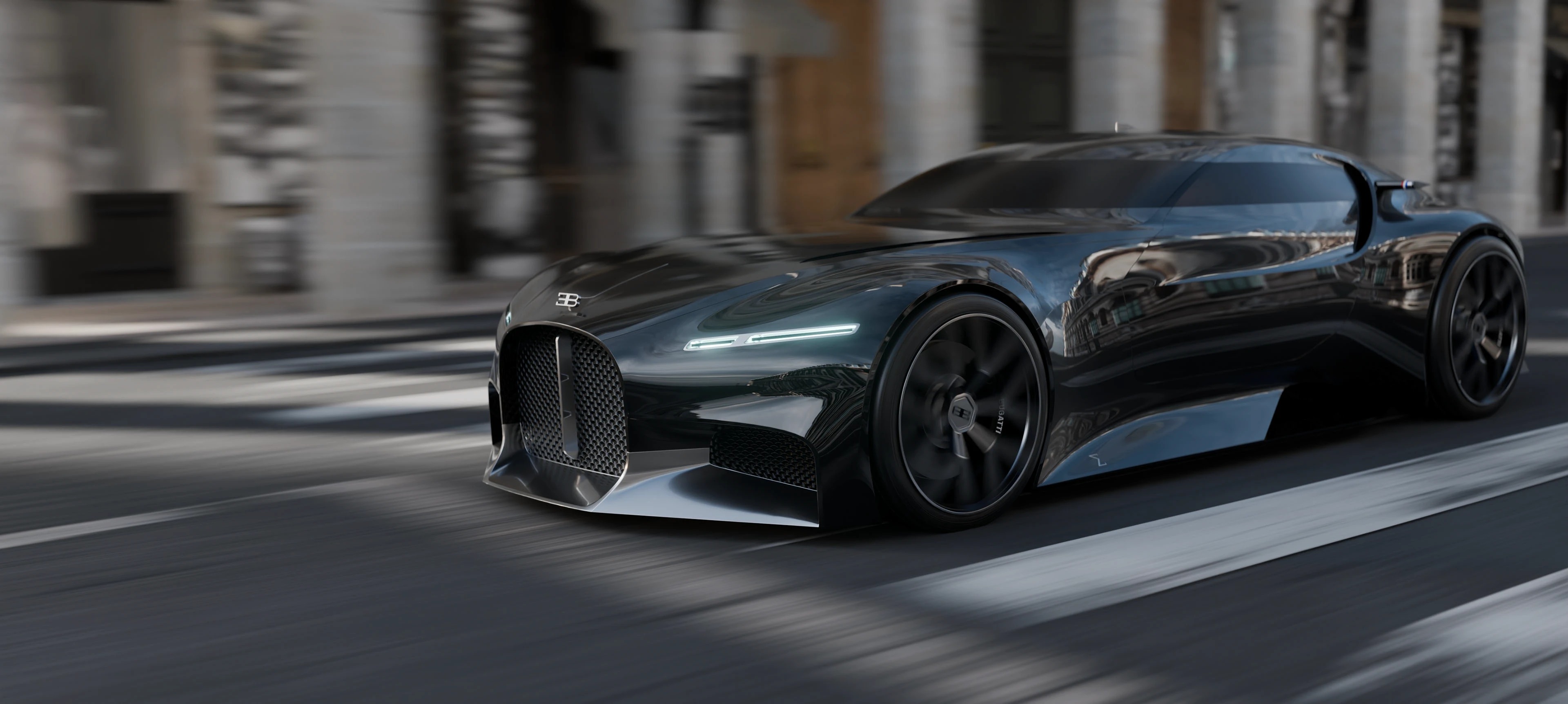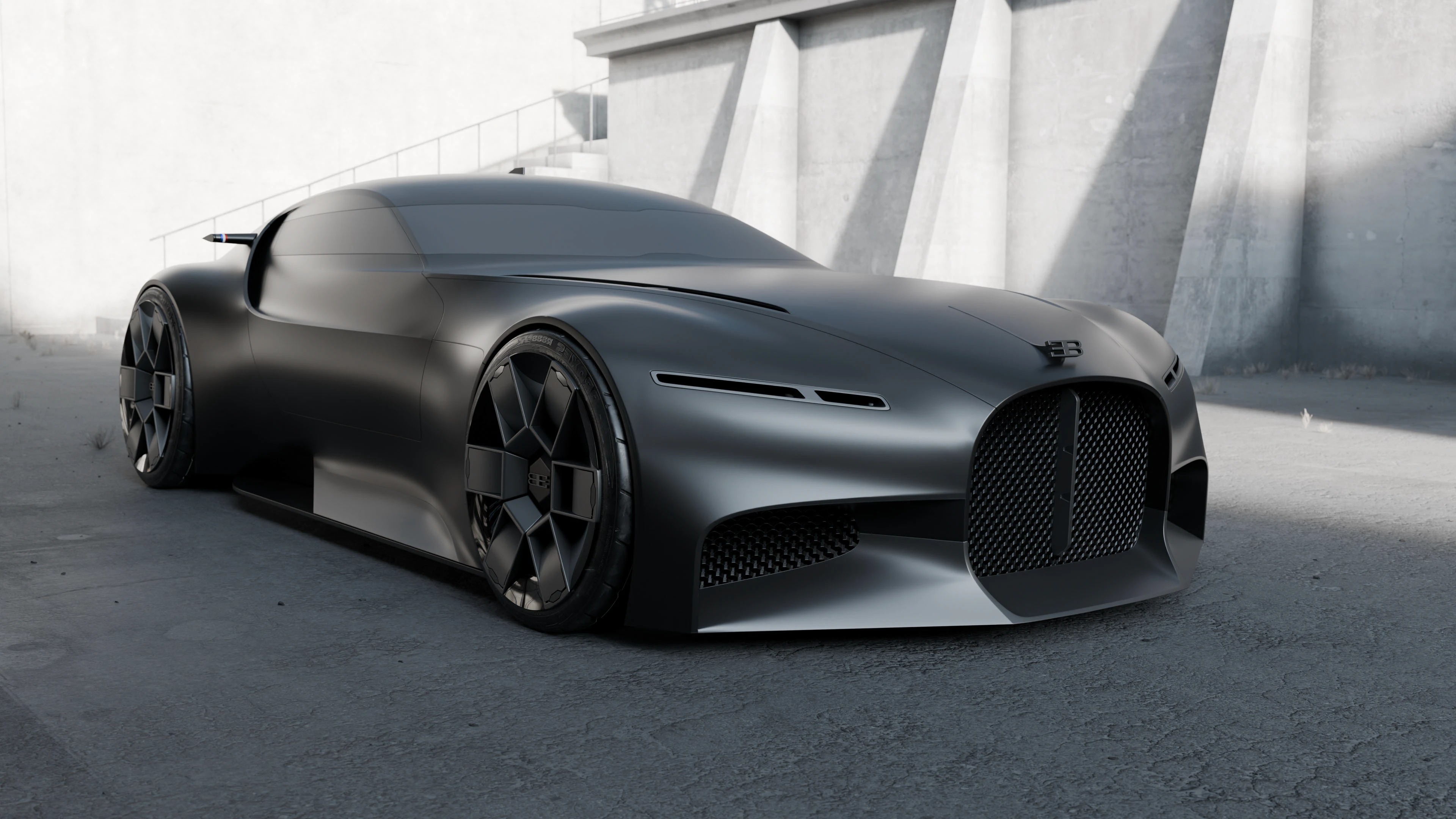 这组概念车渲染图呈现了布加迪对未来超跑的全新诠释,以哑光深灰金属漆为基底,用极简线条重构了品牌标志性的奢华与力量感,车身采用无门把手的一体化曲面,尾部双通风口与贯穿式 LED 灯带呼应,前脸保留了经典的马蹄形格栅,却以更锐利的几何线条重构,搭配多辐式几何轮毂与低趴姿态,既传承了布加迪的性能基因,又注入了未来主义的克制美学,哑光金属漆面在工业风场景中呈现出细腻的光影变化,车身侧面的三色饰条点缀出法式精致,整体摒弃冗余装饰,以纯粹的线条与材质传递出高级质感,工业风的水泥地与建筑背景强化了车辆的冷峻气场,传递出一种克制而强大的未来超跑宣言,适配汽车设计、科技美学、品牌概念宣传等多类场景。