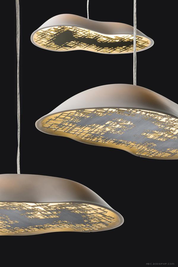 7 张 云状瓷灯-每个挂件有一个黄铜面板悬浮在它下面,通过其独特棱角分明的图案过滤光线,模仿一个切片的陨石