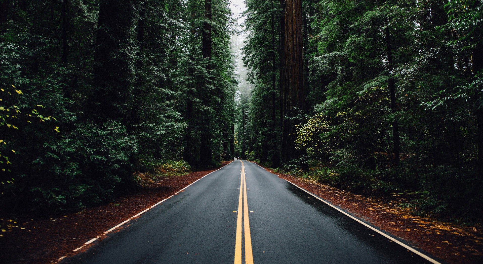 1 张 雨雾下的森林双黄线马路弯道