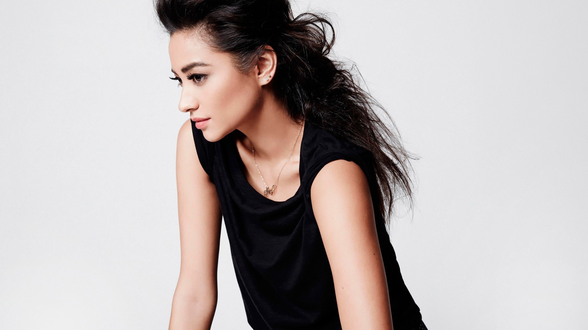 1 张 摸脸的东方黑发白衬衣女郎