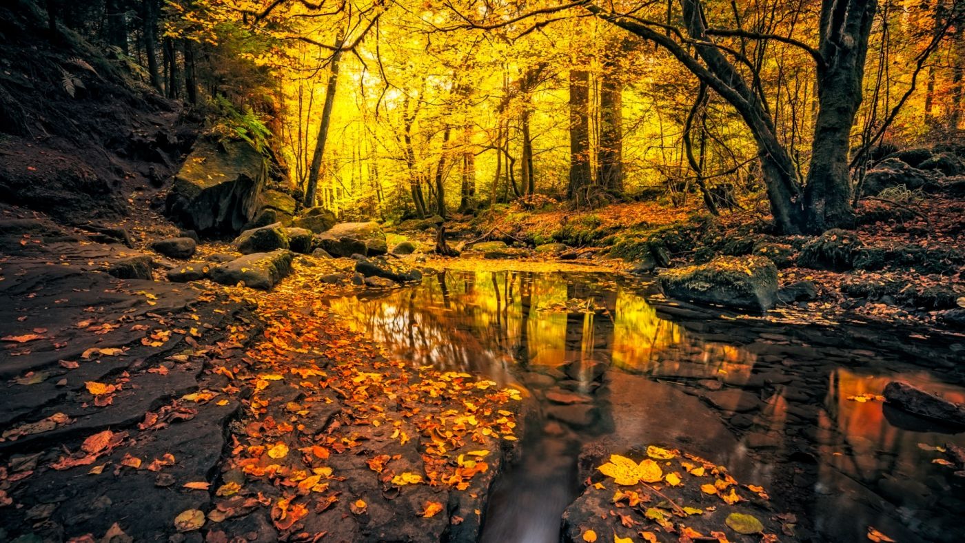 1 张 秋季水沟中的金色枫叶落叶
