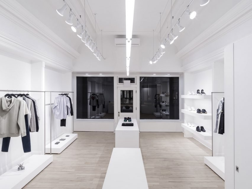 从外面看,玻璃框架的产品显示在白色木制品 - 给游客一个最小的单色空间的印象。