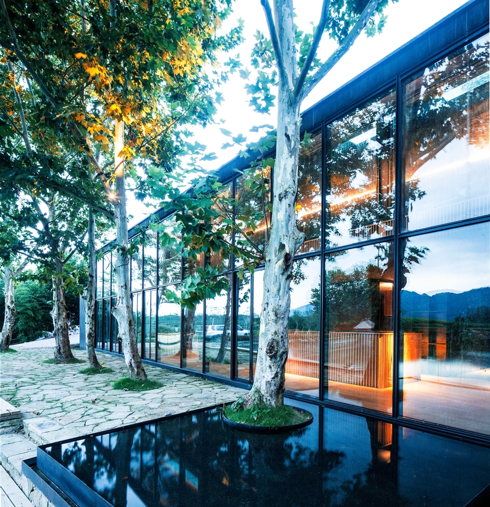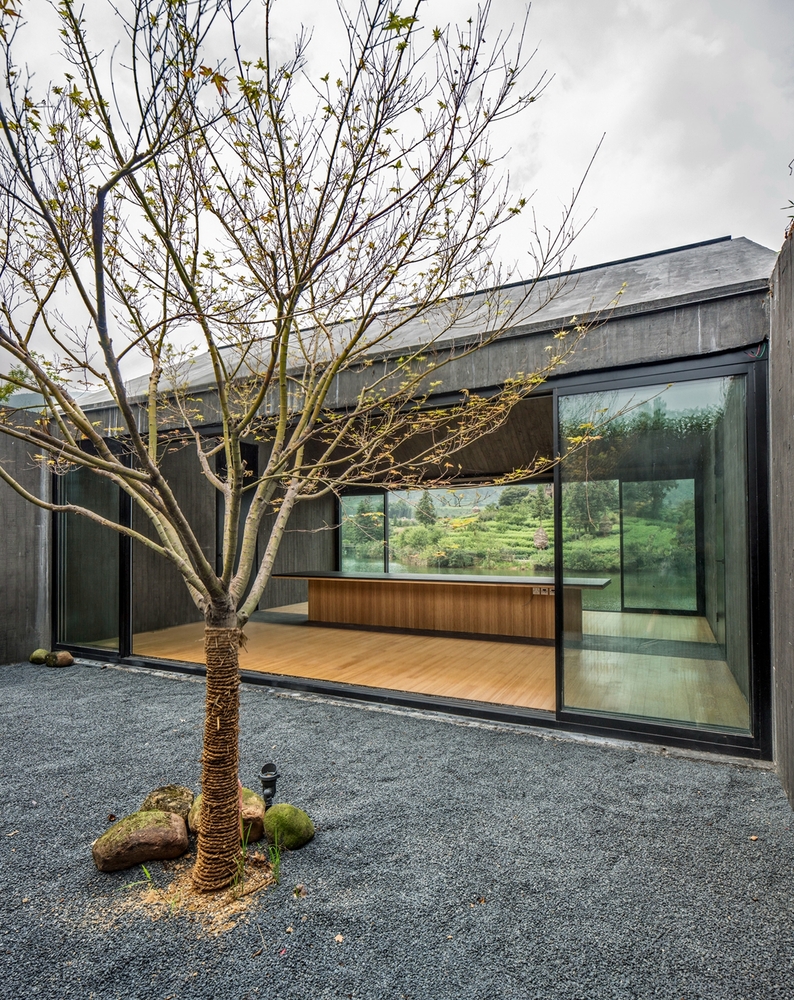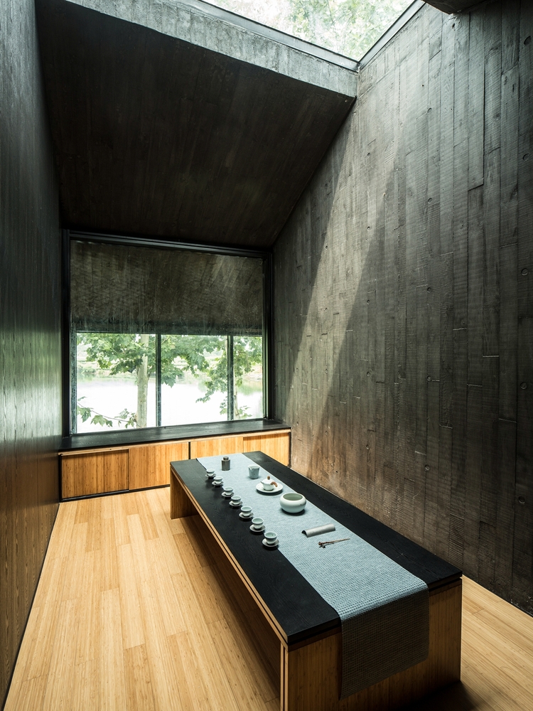 独立茶室内,东西对称的玻璃推拉门可以完全打开,成为一个亭子或者廊桥。 西边,建筑如同画框一般将外面的自然山水框定,引入室内;东侧以一个抽象的庭院和西侧的具体景观形成对比。 茶室的存在,不是为了表现自我,而是当人进入这个建筑后,品茶观景,可以对外面的山水景观有更多的理解,对自然有更多的感悟。