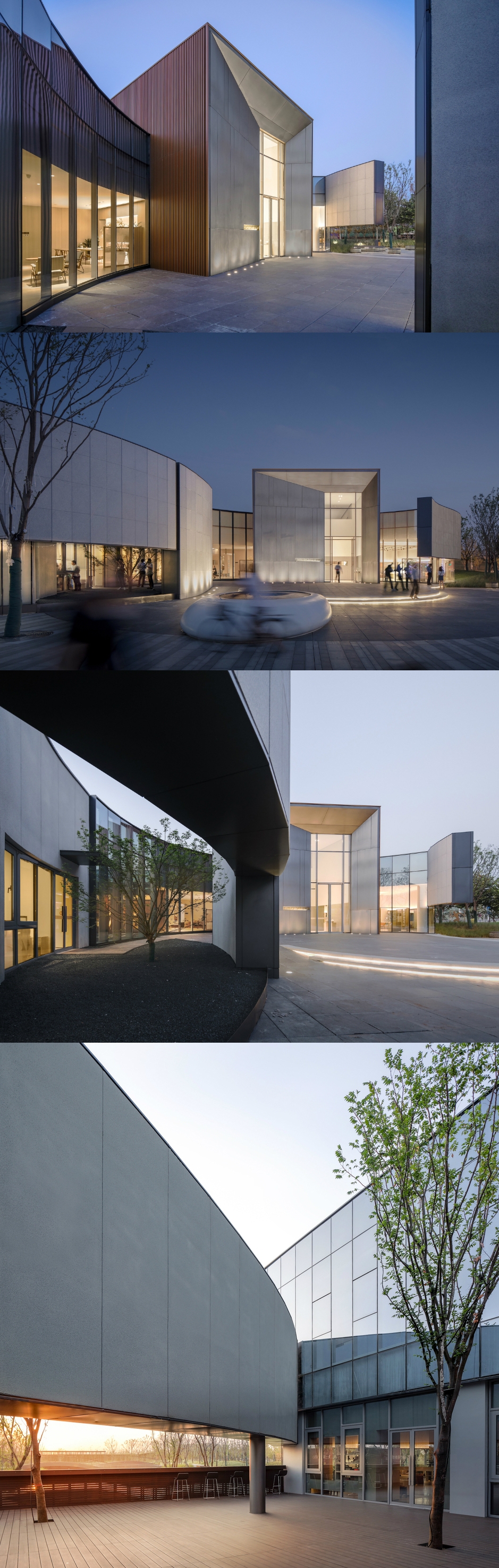 远观,色块分部以及体量大小都随着角度而变化,使整个建筑变得有趣灵动。城市广场面向集群中心退让,吸引人群驻足活动;面向水面,则制成悬挑,轻盈飘浮;面向城市快速路,则以舒展体量为主,沉稳流畅。