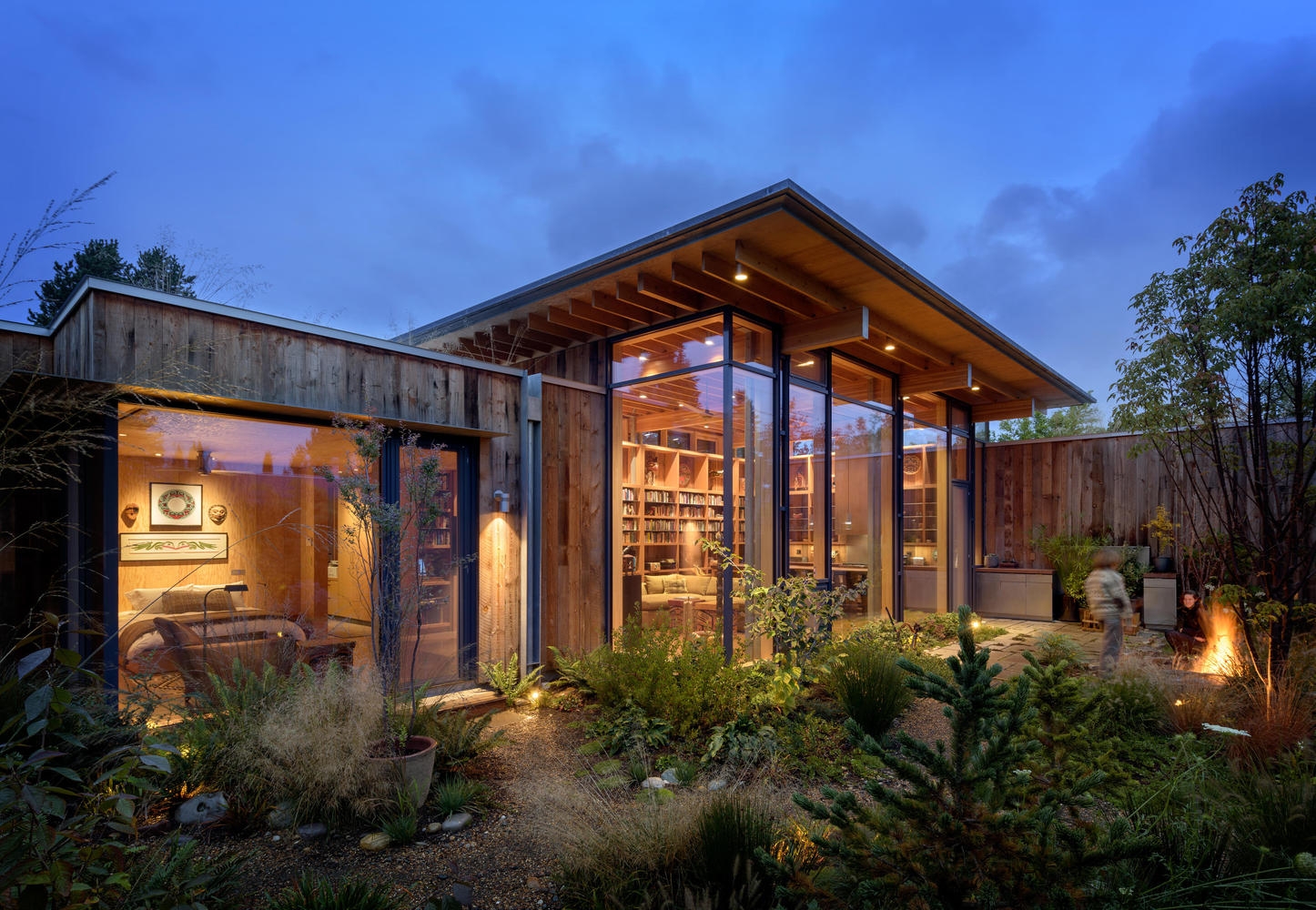 材料与装配方式的选择,首先考虑的是经济因素和可持续要求,不过,在颜色的选择上,同样也从客户广泛的印第安艺术收藏中攫取灵感。混凝土地板以一种自创的红色调着色,参考红衫木与赭石色,而墙壁和天花板则使用自然的、纯朴的胶合板,材料耐久而组装简易。 在外部,枞木护墙板是从临近的一家水果仓库中回收得来的,将其自然风化到仅需要最小限度的养护。耐久的镀锌钢板屋面,以及电镀钢板梁端保护,补充了原木尽端的不足,呈现出饱满的光泽。除了回收材料使用之外,住宅还采取了一些环保策略,包括绿植屋面,反映出客户长久的对环境保护的参与。