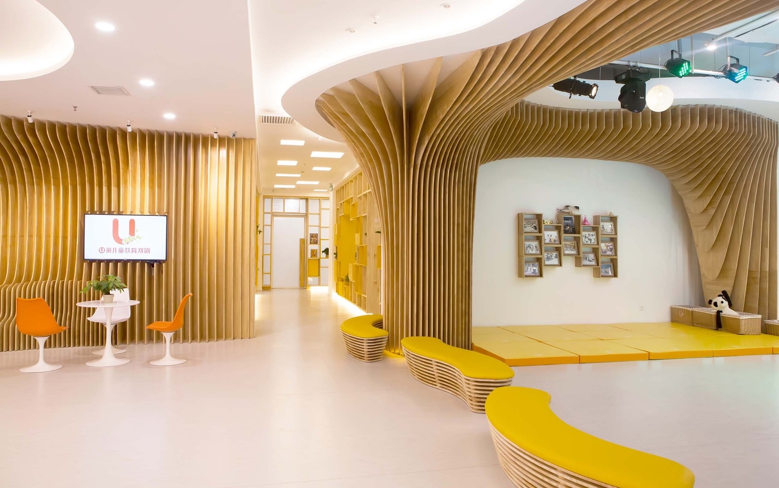 个性化的木制几何图形是通过使用单片木板的数控机床制造工艺(CNC milling)定制的。创建从数字模型到建造的标准化流程,通过一套独特的新颖图纸和技术来协调安装和施工精度。这一建造技术运用于大量的空间造型,排列出一套造型独特、视觉冲击力强的空间造型,并与之功能与人体工程学使用相对应。