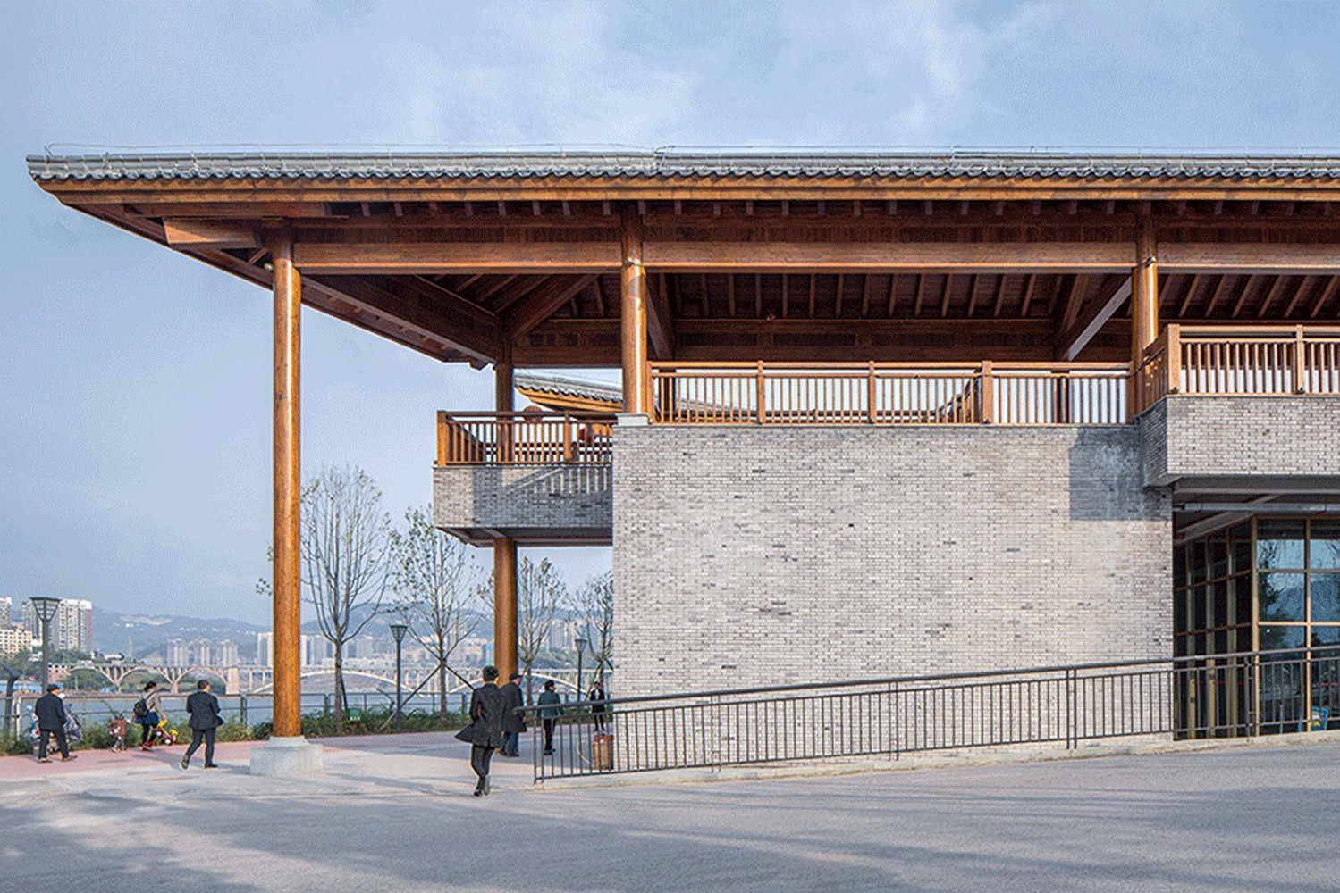 澎溪河宽阔的河面上,远处的层叠山脉延伸入江水中,在基座之上,四方井服务建筑的坡屋顶沿着江面漂浮展开,融入远处山峰的轮廓。设计以尽量减少土方量为原则,梳理了场地的高差,将建筑的南侧两层切入场地,东、西侧局部一层切入场地,形成建筑双首层“基座”。其中首层与北侧滨江景观带相接,二层与西侧城市道路相接。基座的建造转换了地景,提供了观看江景的平台,如同伍重面对悉尼港,屋檐与基座也成为我们解答风景与场地这一命题的答案。