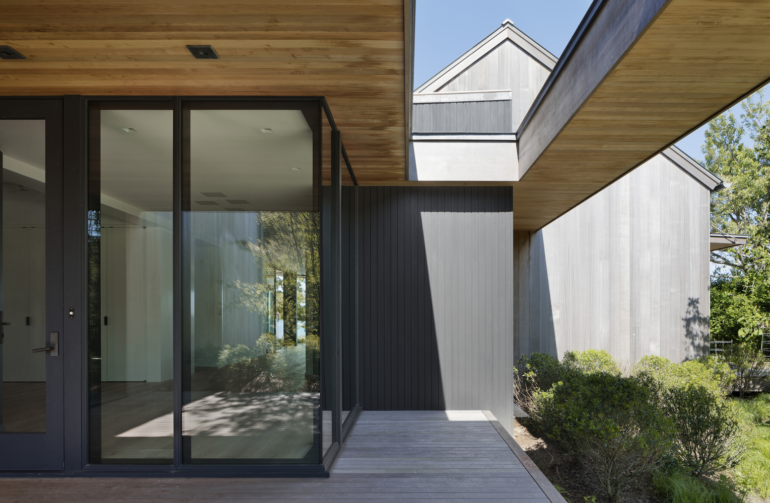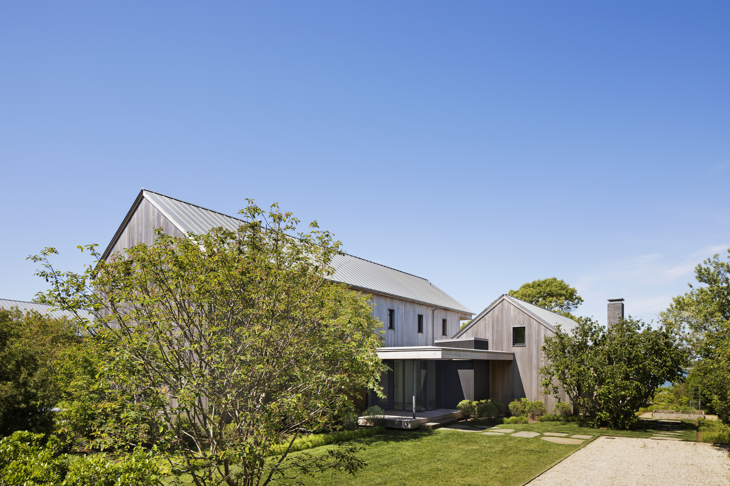 这两座建筑都作为居住空间使用,无论是室内还是室外,都希望尽量扩大视野范围,以捕捉夏日阳光与清风。蒙托克湖是这儿的焦点,但不是唯一一个,其次,还有许多檐下空间与广阔的水景相映成趣。主要的生活空间安排在接地的一层,使用玻璃和超大的滑动门分隔室内与室外,减弱室内与自然的边界。在房屋与水域之间种植当地的再生海岸植物,加强了建筑与自然之间的对话。