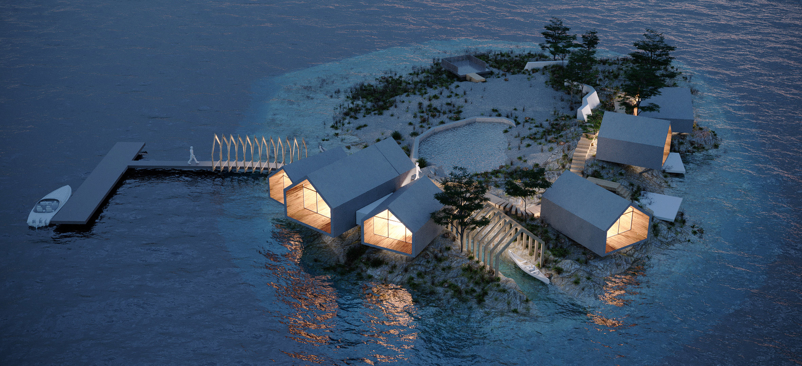 去往拉特岛一般走航线或者水路。正如工作室所说,“有一条一百年前从岩石中开凿出来的小运河贯穿了这个岛,我们应当将其考量进入设计,因此,小艇和小船能够在涨潮时直接到达主要建筑下方。包括沙土和低矮植物在内,它大概有2.5英亩(一公顷)大。”