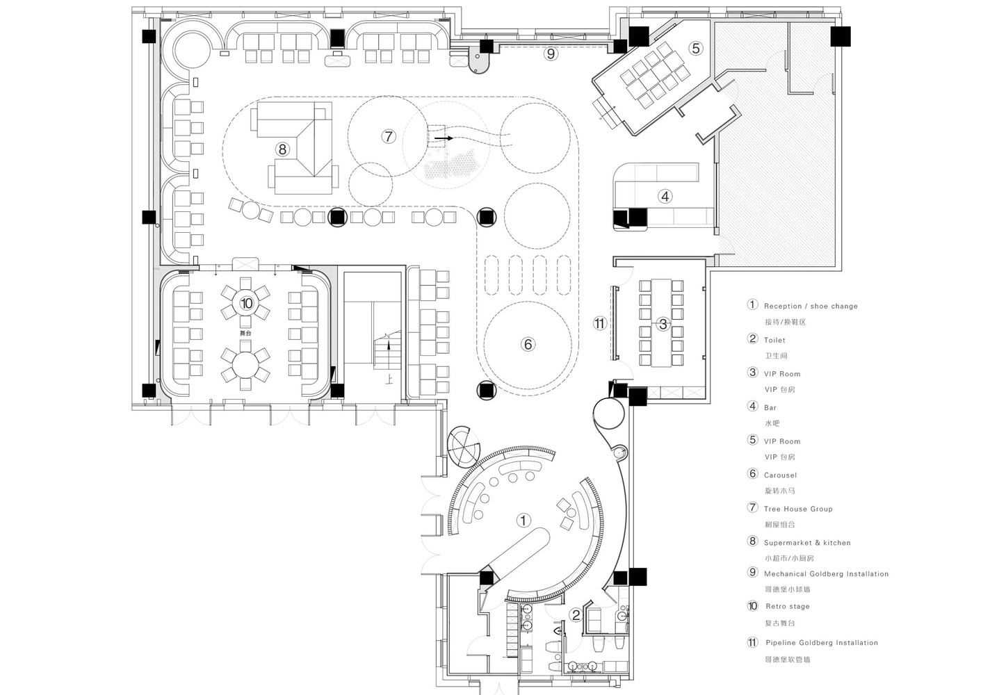 孩子们,你的人生不会无人见证,因为我们会为你见证。在仙境里,每个孩子都是主角,我们为他们打造了一个舞台。红色的天鹅绒帷幕缓缓拉开,我们仿佛看到一个古老的回忆,灯泡招牌一闪一闪,古旧的木地板,漂亮壁纸和水晶花枝灯。涟漪在远处也呼应地一闪一闪,未来与过去直接交汇在一起,用餐和表演都可以,孩子们,the stage is yours!