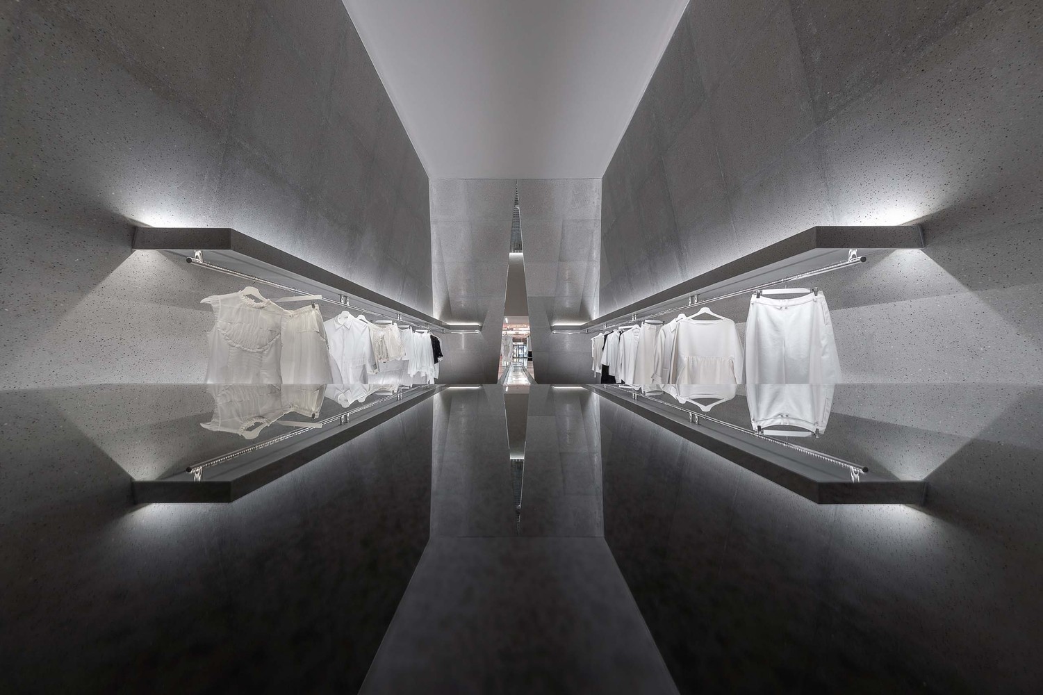 通过独特的布局方式使客户具有清晰的行驶动线且在行走过程中能看到完整的商品陈列, 方便顾客挑选及对比商品。设计方案则根据场地的自身狭长的特点并结合品牌对艺术、行为、展示多方面的功能需求。无论从店铺外的任意一个角度往里看, 空间的层次感与材质的碰撞都成为一道路过的风景。