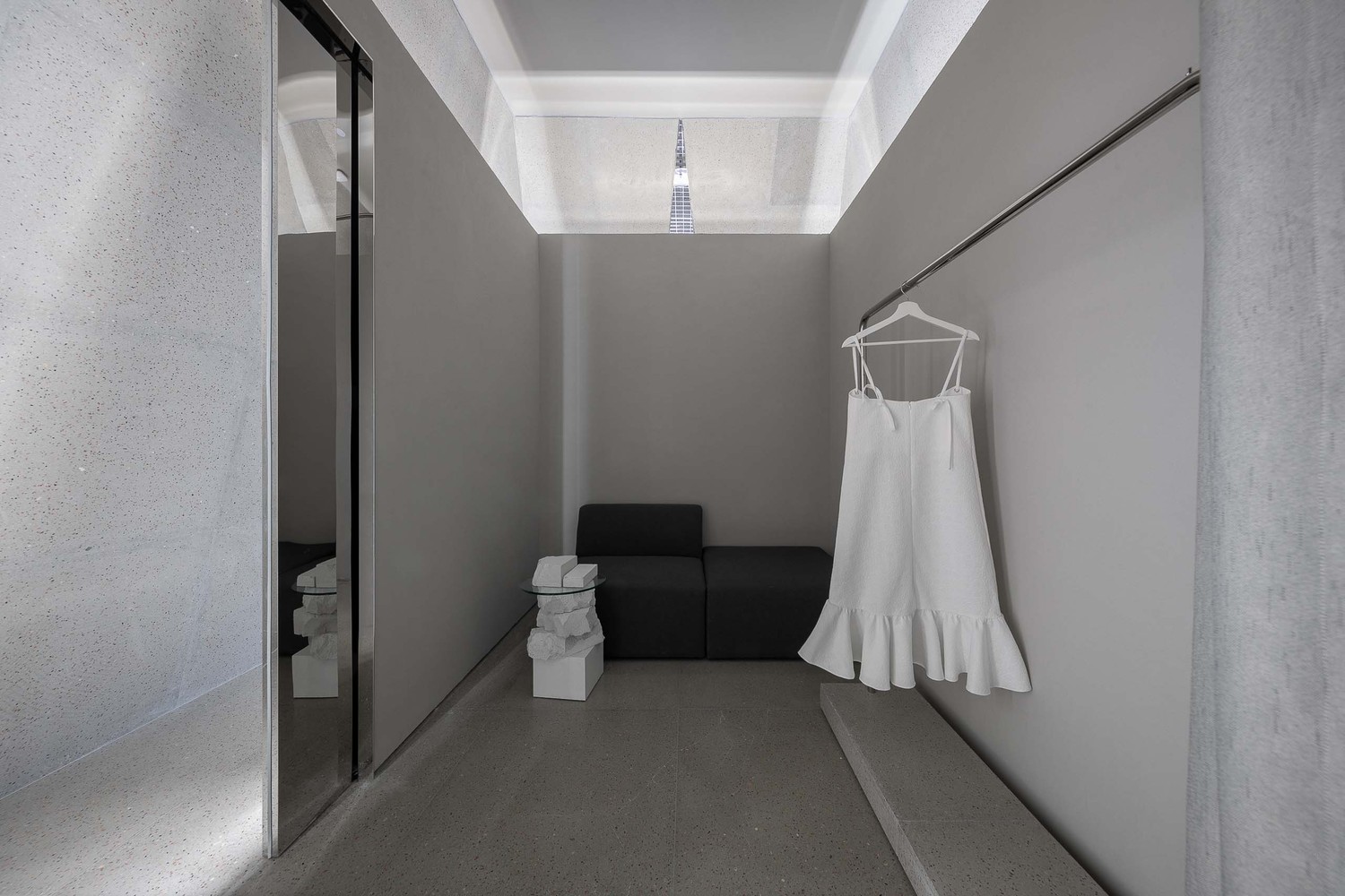 珠宝展示于中心的长直线展柜,易于客户细心挑选,高定衣服品牌则陈列于空间内两侧,均以专业柔和的灯光照射以展示衣物自身的质感。