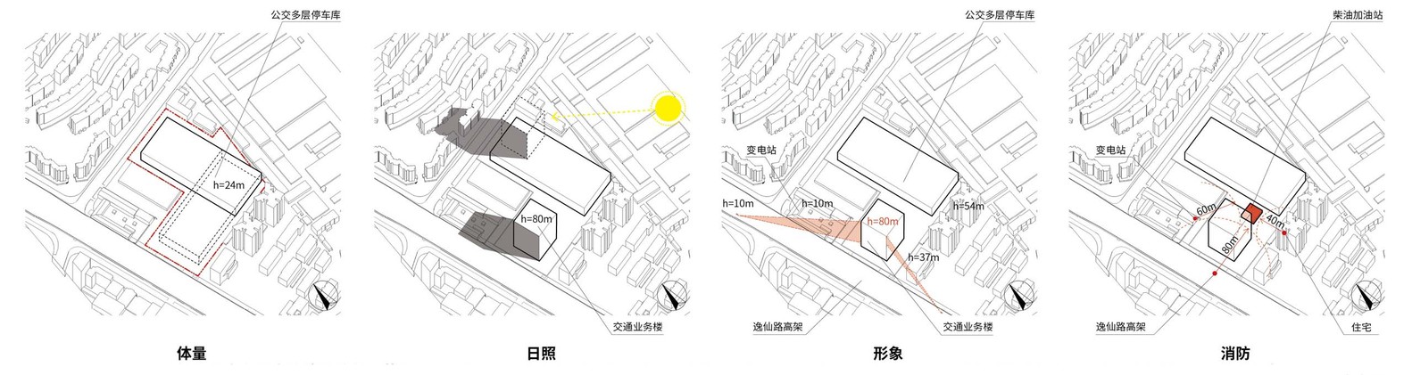 根据公交车进出流线、停保工艺和按最高效的“建四停五”布局方式,352辆大巴停车库的平面是个长宽比约1:2的矩形,高度近24米,为减少对北边小区的日照影响,将多层停车库竖着放在基地东侧。将高层交通业务楼放在逸仙路高架东侧,其北侧是2层高的变电站,这样更有利于公交企业形象展示。根据消防要求,将加油站放在用地中部,可远离住宅、变电站、高架路,将安全隐患降至最低。